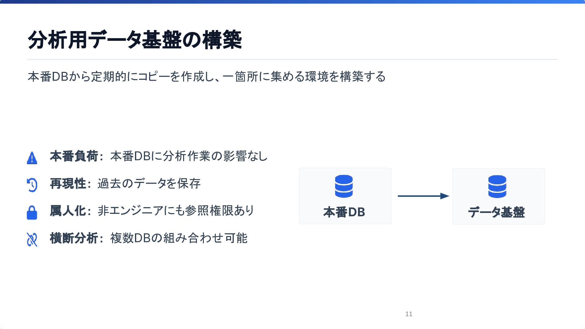 本番DBから定期的にコピーを作成し、一箇所に集める環境を構築する 分析用データ基盤の構築 11 本番負荷: 本番DBに分析作業の影響なし 再現性: 過去のデータを保存 属人化: 非エンジニアにも参照権限あり 横断分析: