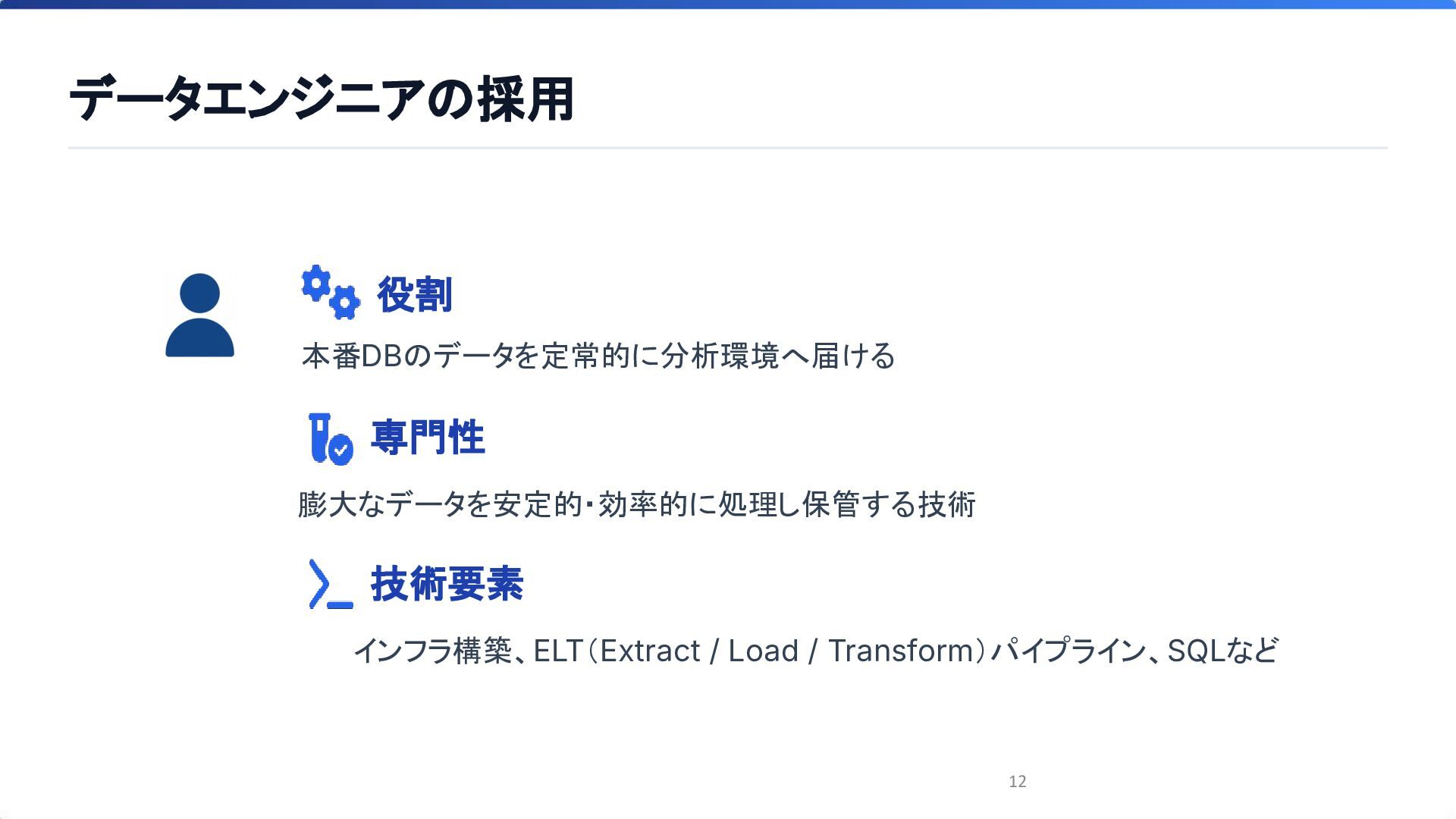 役割 本番DBのデータを定常的に分析環境へ届ける 専門性 膨大なデータを安定的・効率的に処理し保管する技術 技術要素 インフラ構築、ELT(Extract / Load / Transform)パイプライン、SQLなど