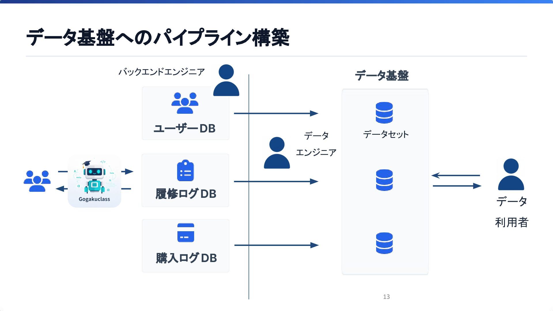 13 データ基盤へのパイプライン構築 ユーザーDB 履修ログDB 購入ログDB バックエンドエンジニア データ 利用者 データ エンジニア