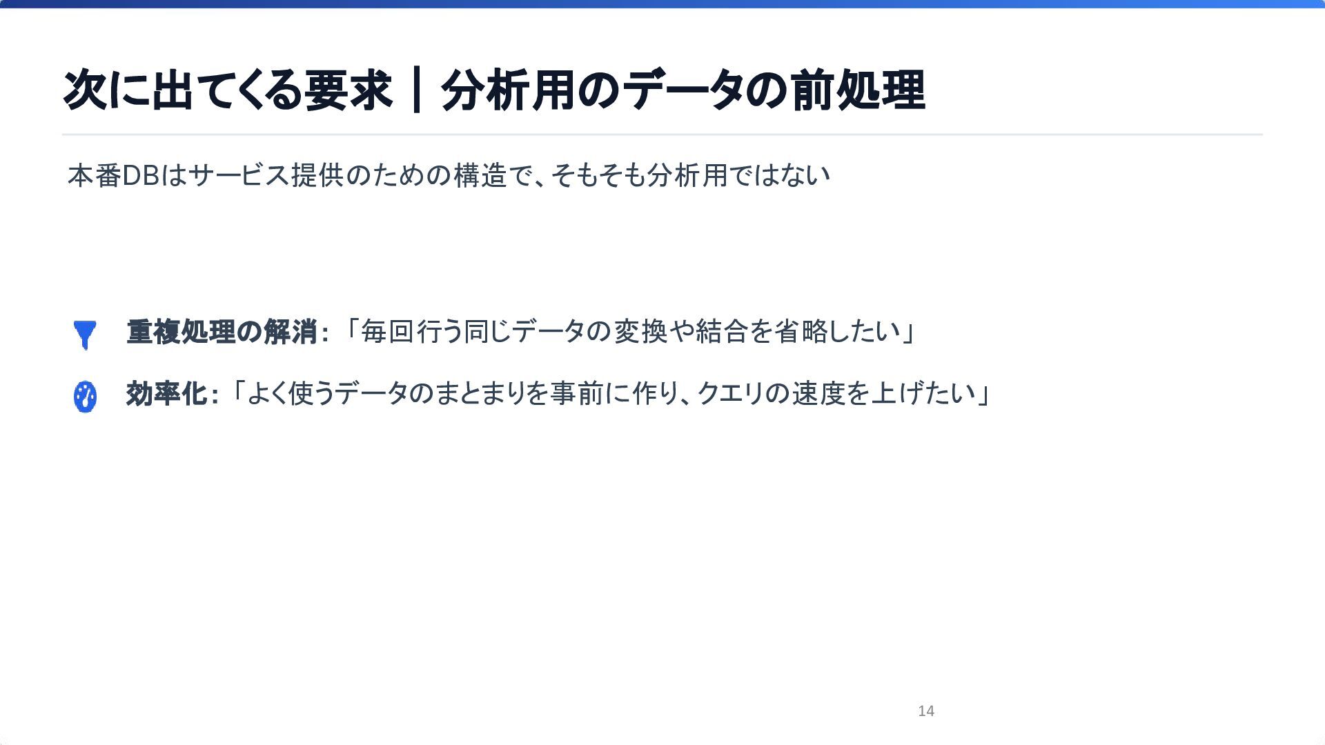 重複処理の解消: 「毎回行う同じデータの変換や結合を省略したい」 効率化: 「よく使うデータのまとまりを事前に作り、クエリの速度を上げたい」 次に出てくる要求|分析用のデータの前処理 14 本番DBはサービス提供のための構造で、そもそも分析用ではない