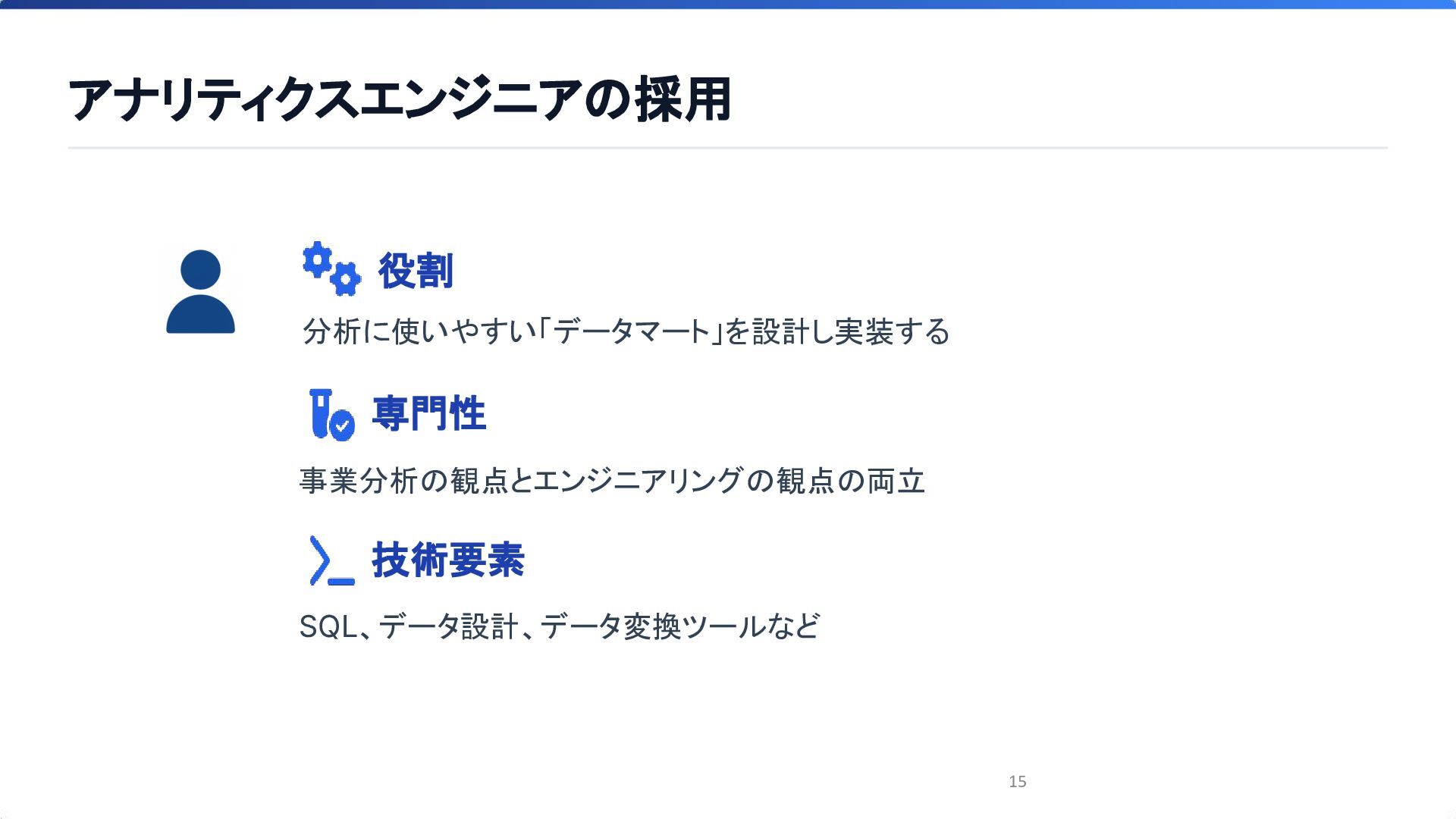 アナリティクスエンジニアの採用 15 役割 分析に使いやすい「データマート」を設計し実装する 専門性 事業分析の観点とエンジニアリングの観点の両立 技術要素 SQL、データ設計、データ変換ツールなど