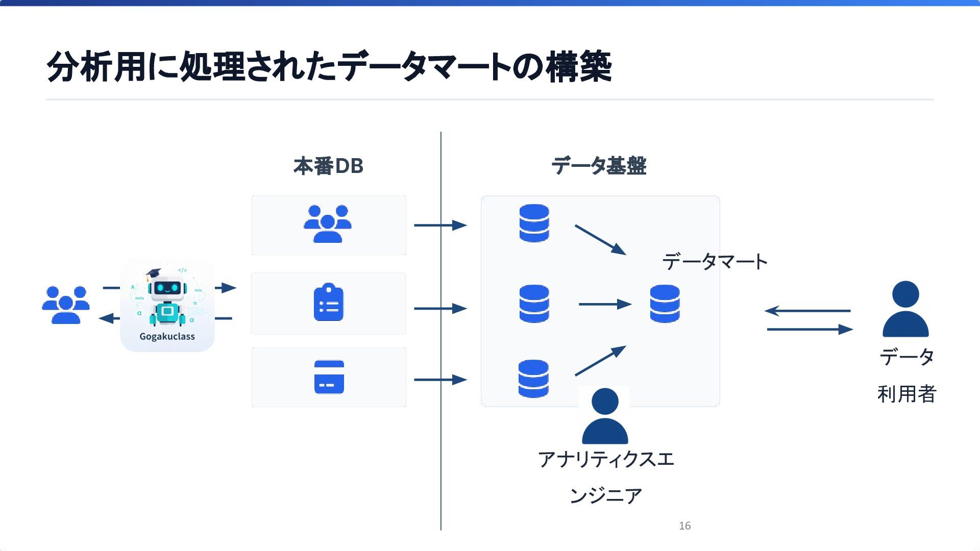 16 分析用に処理されたデータマートの構築 データ 利用者 データ基盤 本番DB アナリティクスエ ンジニア データマート