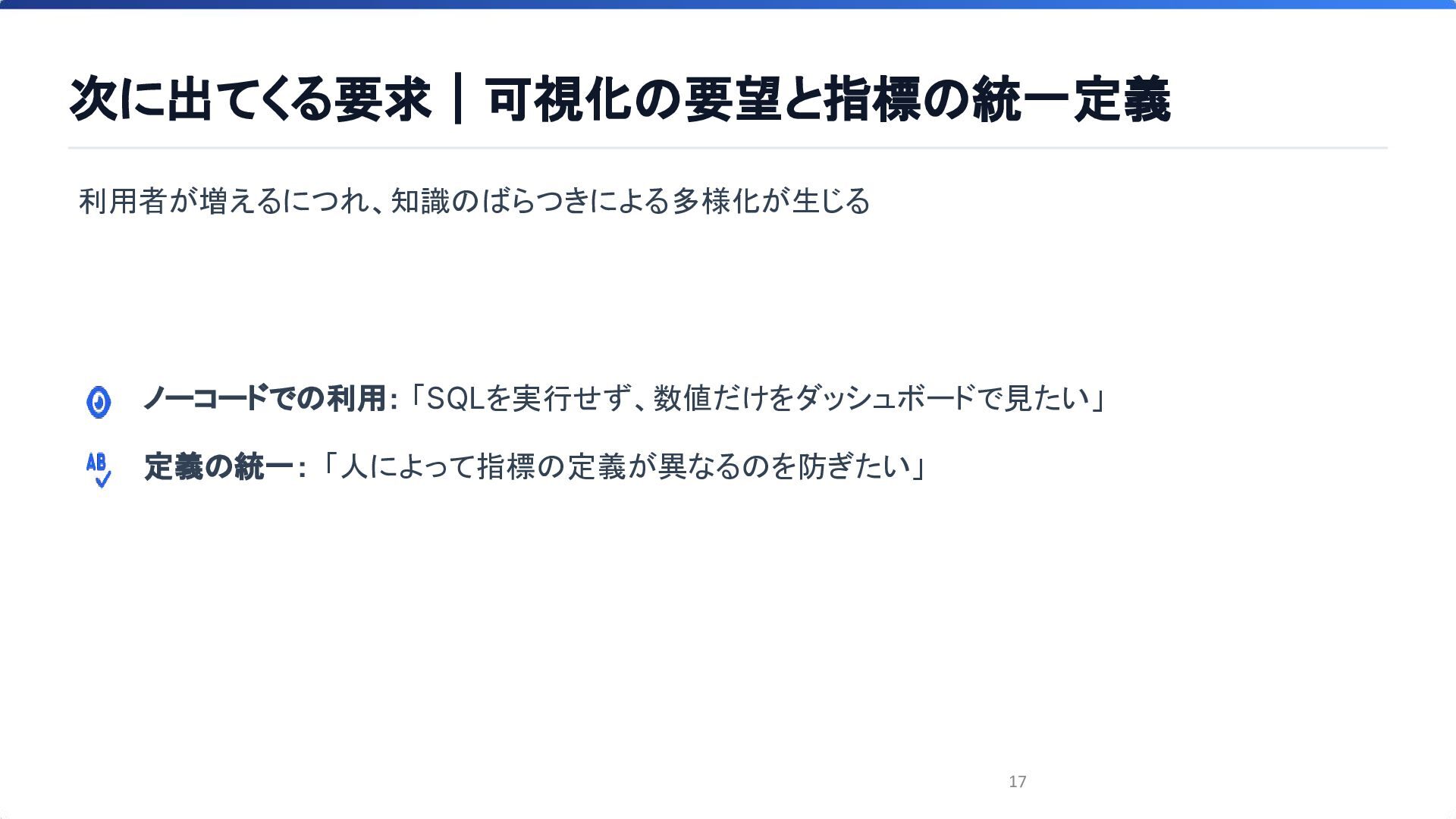 ノーコードでの利用: 「SQLを実行せず、数値だけをダッシュボードで見たい」 定義の統一: 「人によって指標の定義が異なるのを防ぎたい」 次に出てくる要求|可視化の要望と指標の統一定義 17 利用者が増えるにつれ、知識のばらつきによる多様化が生じる