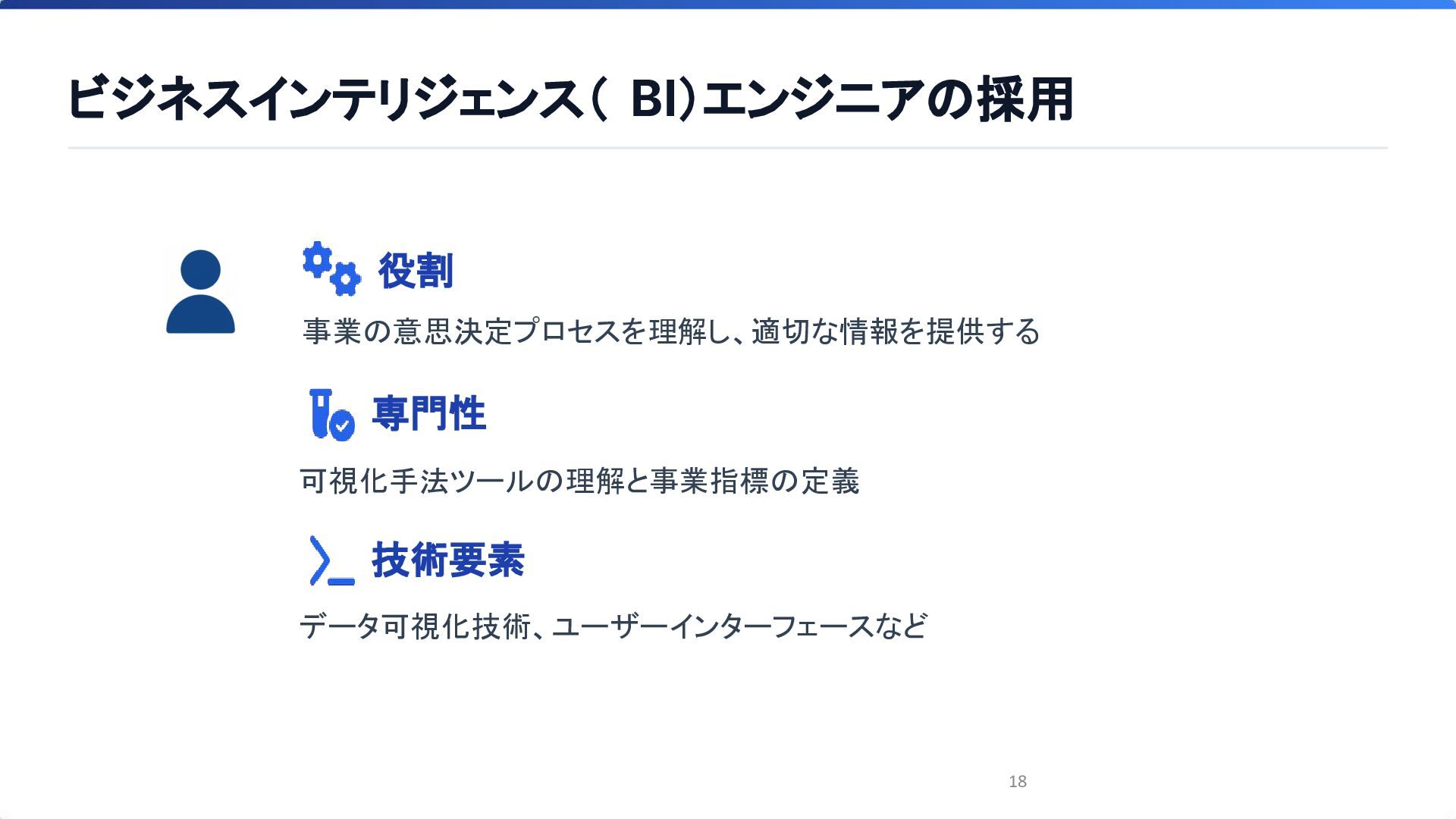 ビジネスインテリジェンス( BI)エンジニアの採用 18 役割 事業の意思決定プロセスを理解し、適切な情報を提供する 専門性 可視化手法ツールの理解と事業指標の定義 技術要素 データ可視化技術、ユーザーインターフェースなど