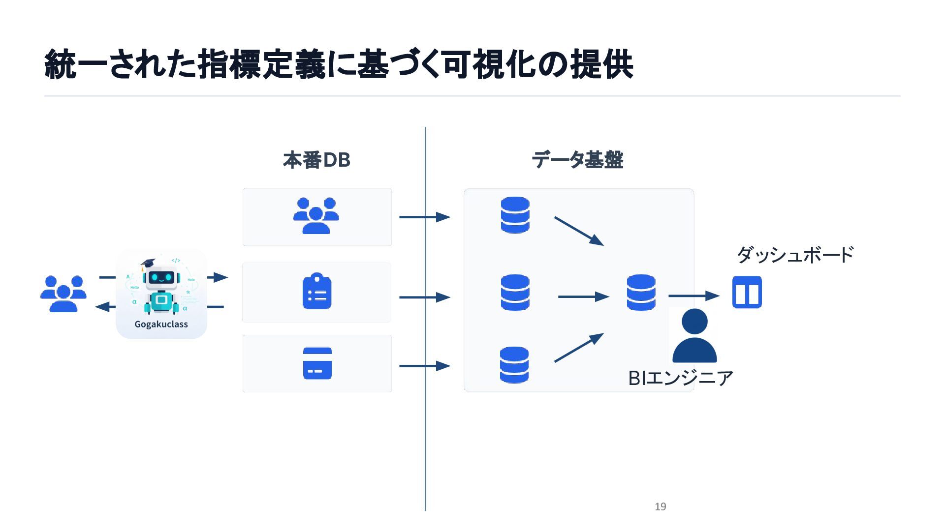 19 19 統一された指標定義に基づく可視化の提供 データ基盤 本番DB BIエンジニア ダッシュボード