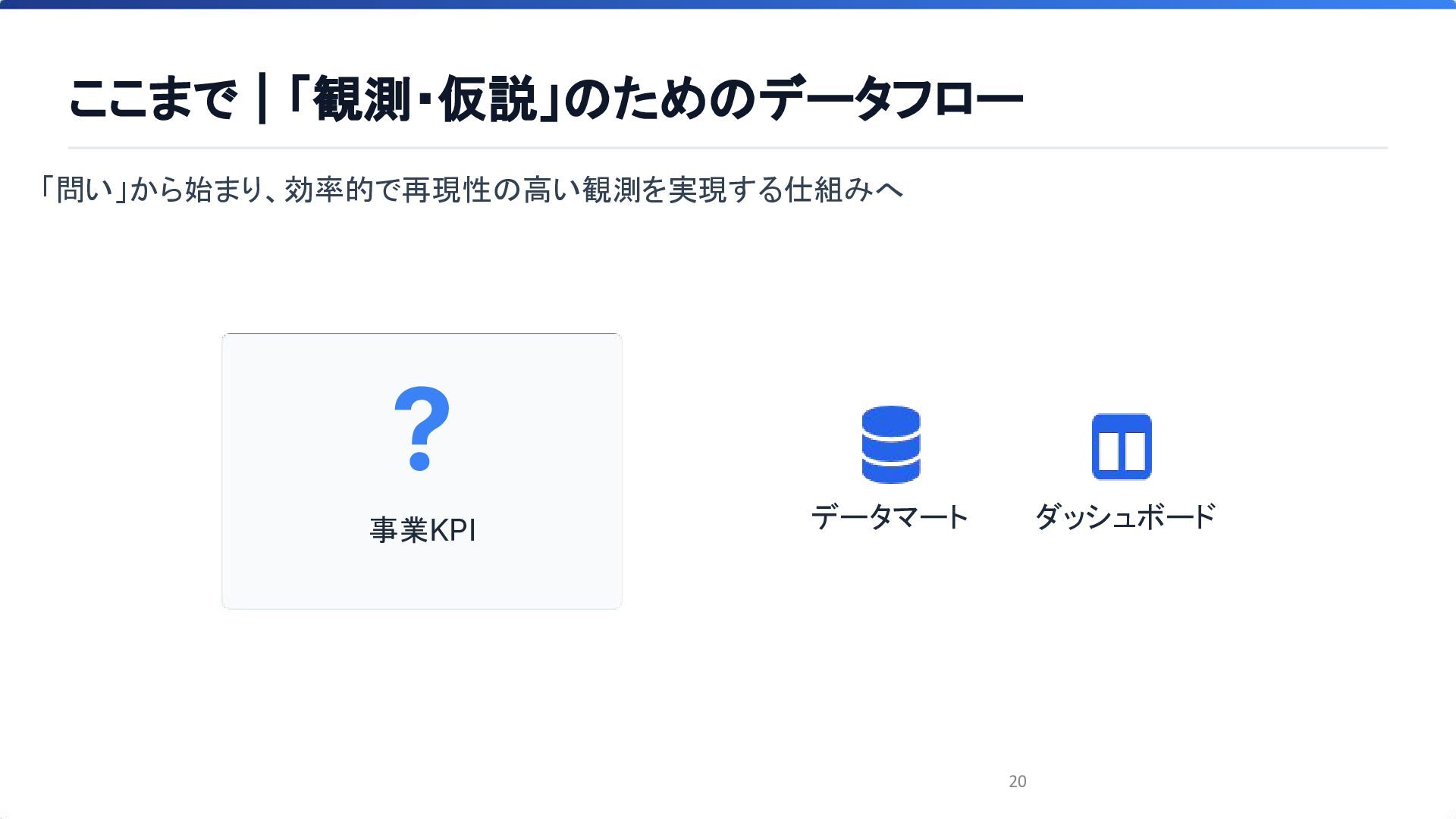 ここまで|「観測・仮説」のためのデータフロー 20 「問い」から始まり、効率的で再現性の高い観測を実現する仕組みへ ? 事業KPI データマート ダッシュボード