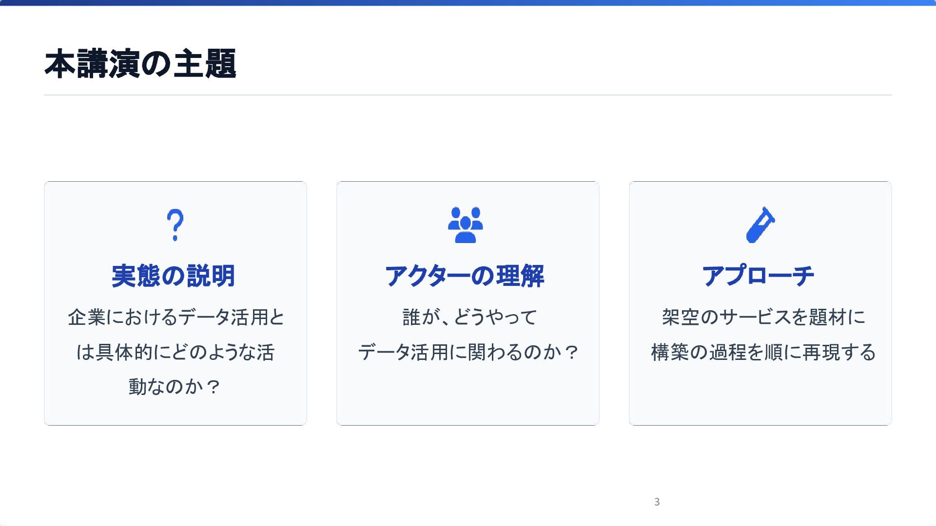 実態の説明 企業におけるデータ活用と は具体的にどのような活 動なのか? アクターの理解 誰が、どうやって データ活用に関わるのか? アプローチ 架空のサービスを題材に 構築の過程を順に再現する
