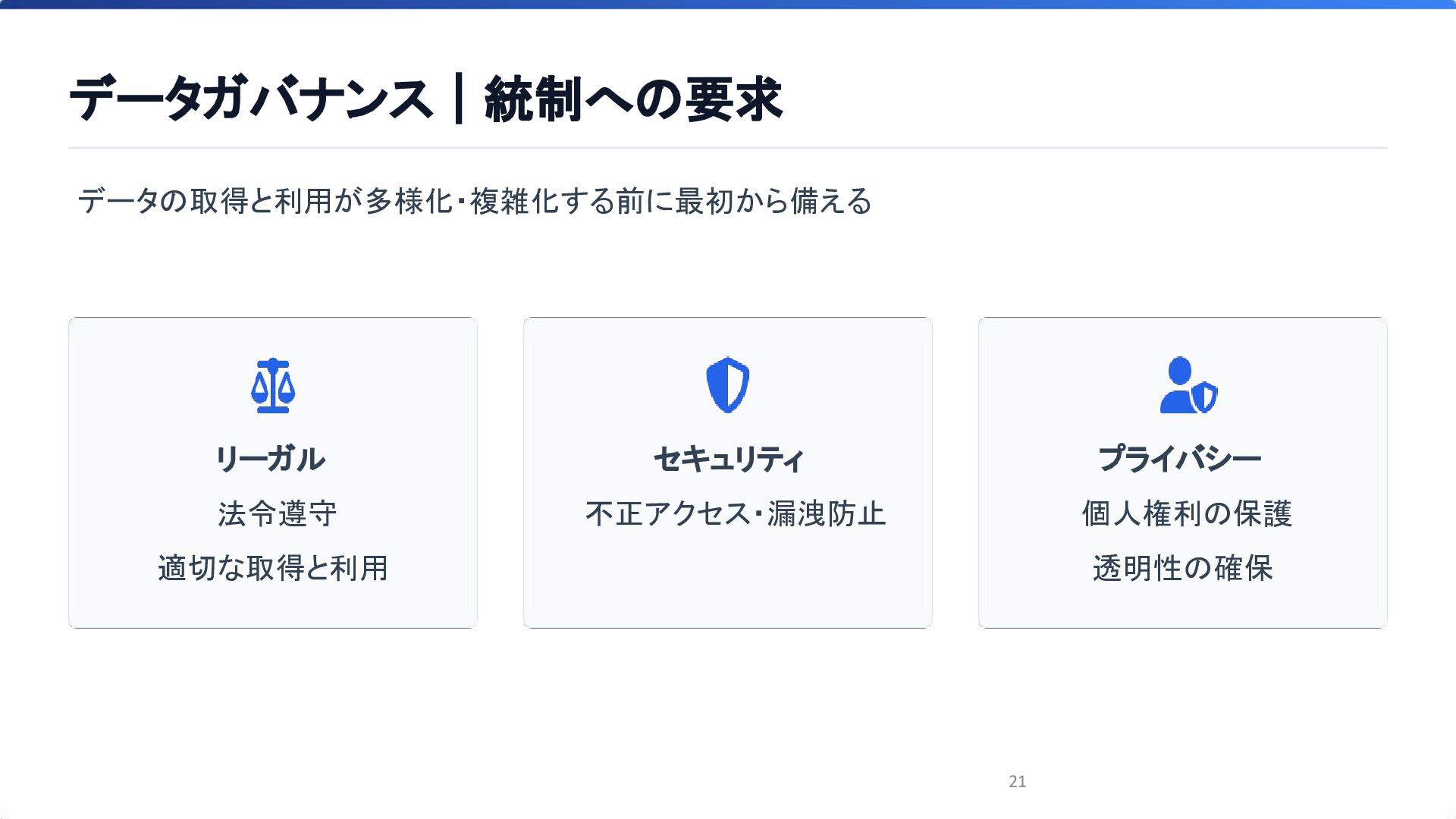 リーガル 法令遵守 適切な取得と利用 セキュリティ 不正アクセス・漏洩防止 プライバシー 個人権利の保護 透明性の確保 データガバナンス|統制への要求 21