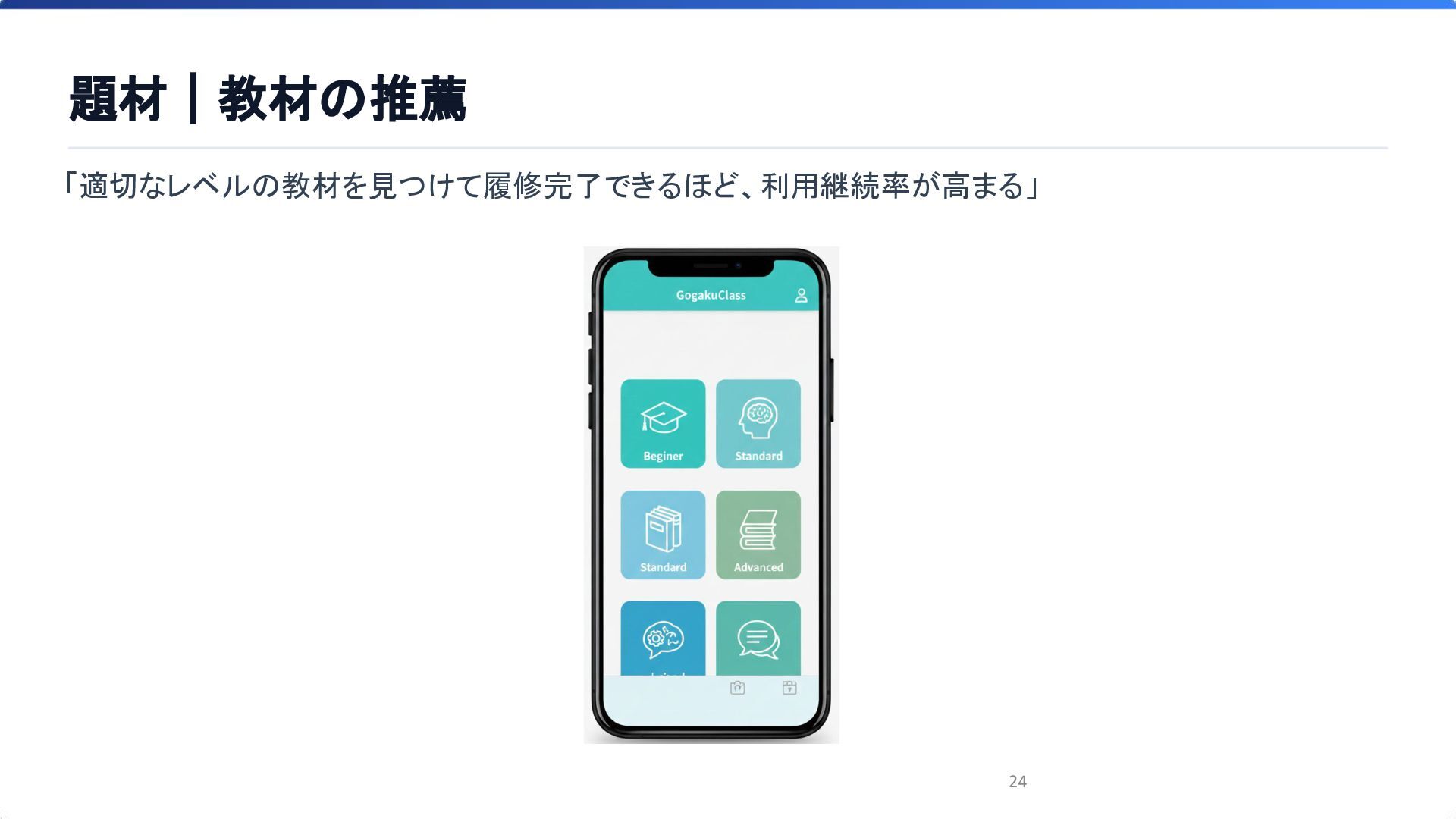 24 題材|教材の推薦 「適切なレベルの教材を見つけて履修完了できるほど、利用継続率が高まる」