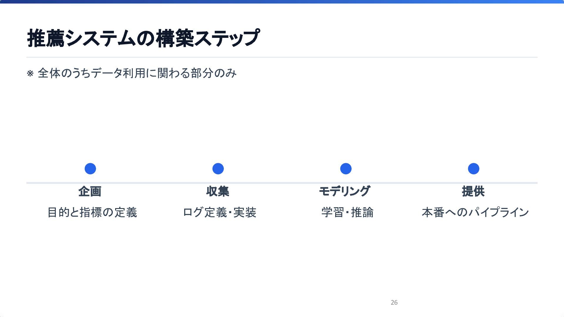 企画 目的と指標の定義 収集 ログ定義・実装 モデリング 学習・推論 提供 本番へのパイプライン 推薦システムの構築ステップ 26