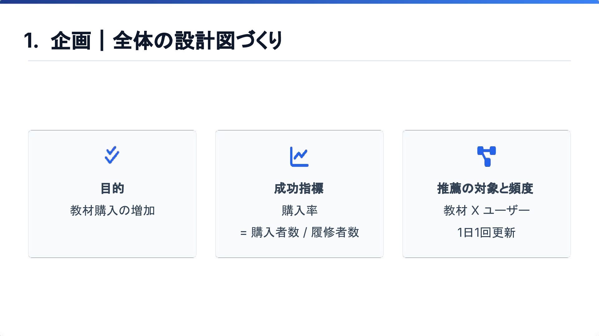 27 1. 企画|全体の設計図づくり 目的 教材購入の増加 成功指標 購入率 = 購入者数 /
