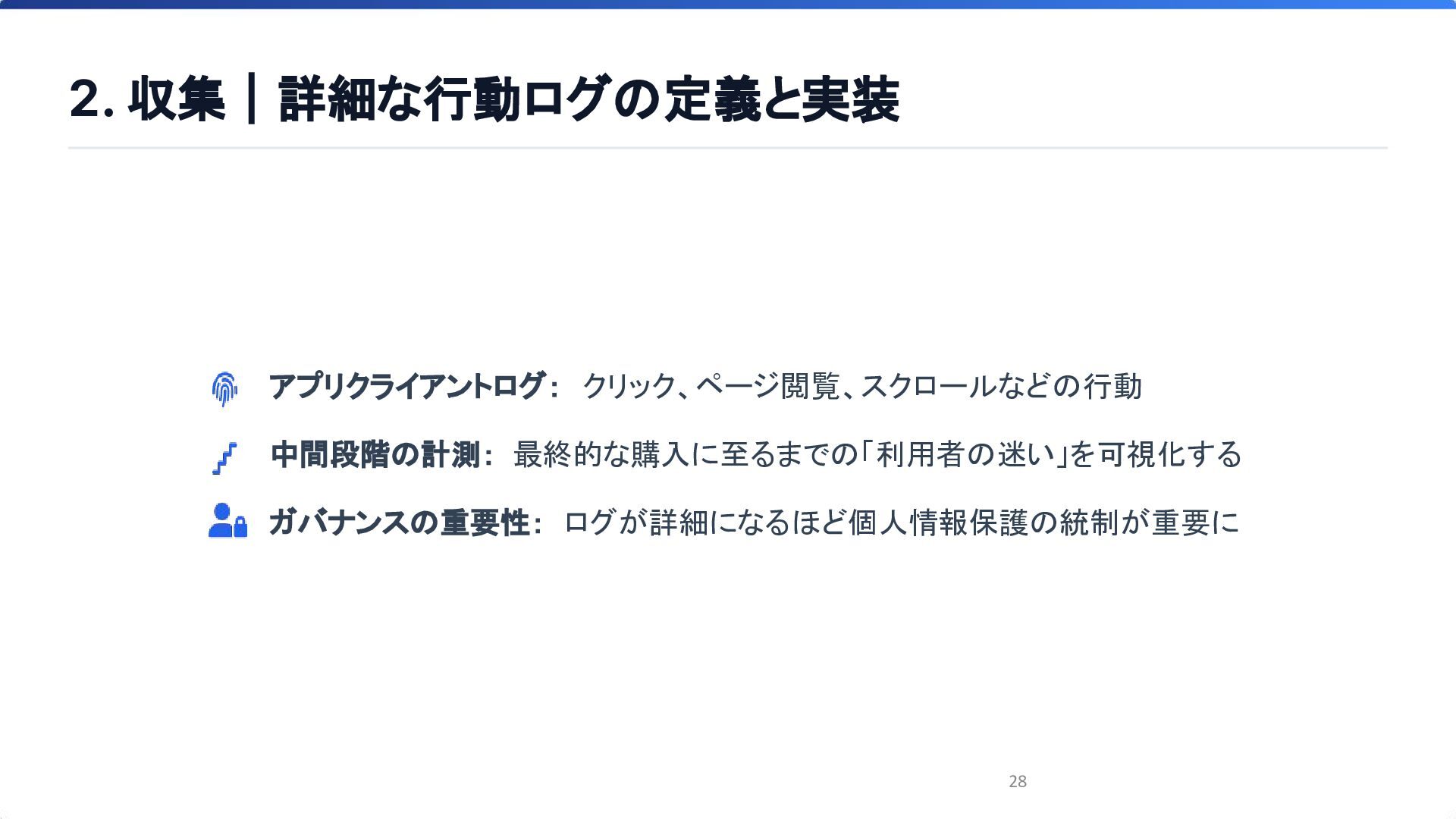 アプリクライアントログ: クリック、ページ閲覧、スクロールなどの行動 中間段階の計測: 最終的な購入に至るまでの「利用者の迷い」を可視化する ガバナンスの重要性: ログが詳細になるほど個人情報保護の統制が重要に 2. 収集|詳細な行動ログの定義と実装 28