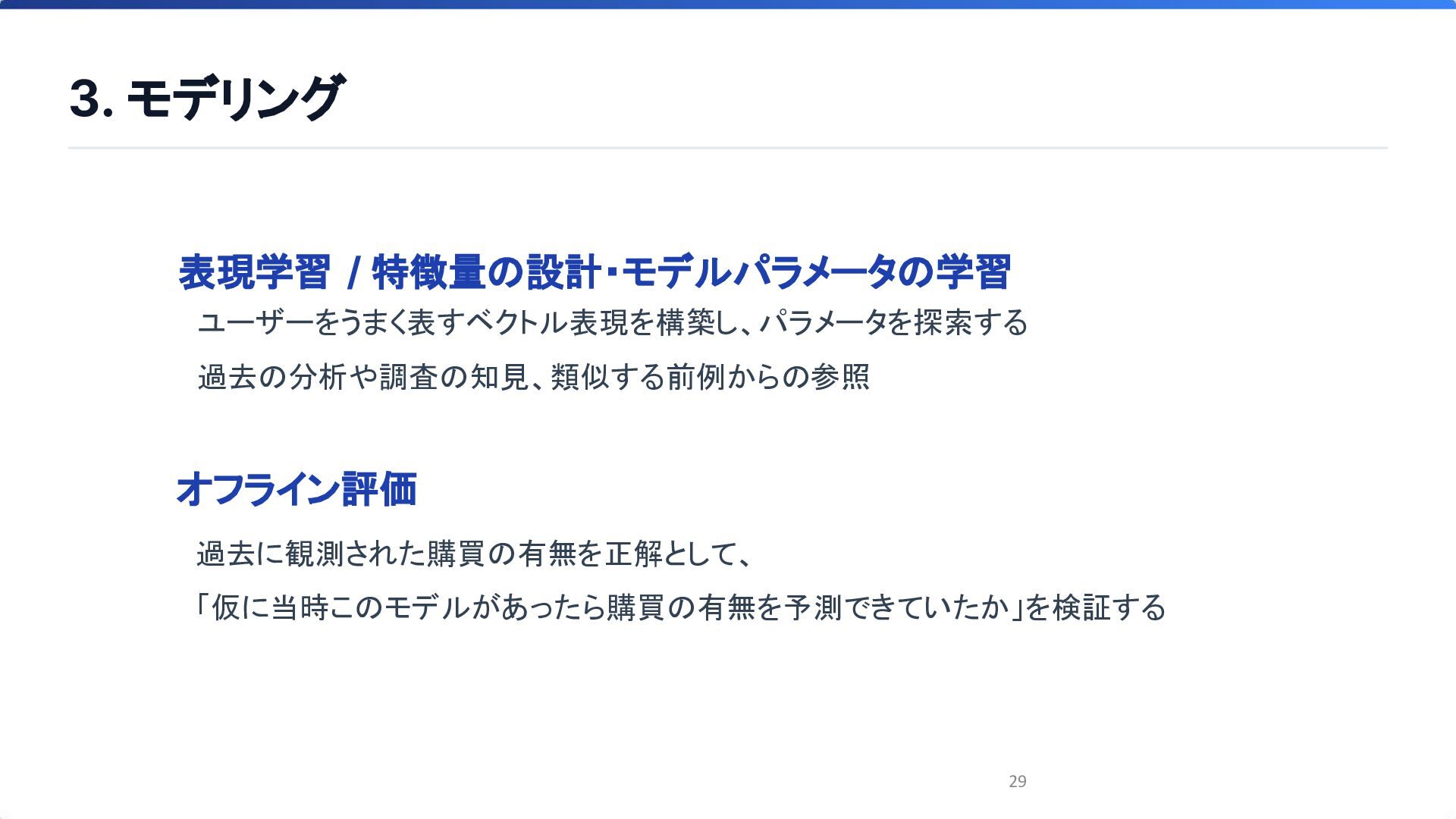 オフライン評価 過去に観測された購買の有無を正解として、 「仮に当時このモデルがあったら購買の有無を予測できていたか」を検証する 3. モデリング 29 表現学習 / 特徴量の設計・モデルパラメータの学習 ユーザーをうまく表すベクトル表現を構築し、パラメータを探索する
