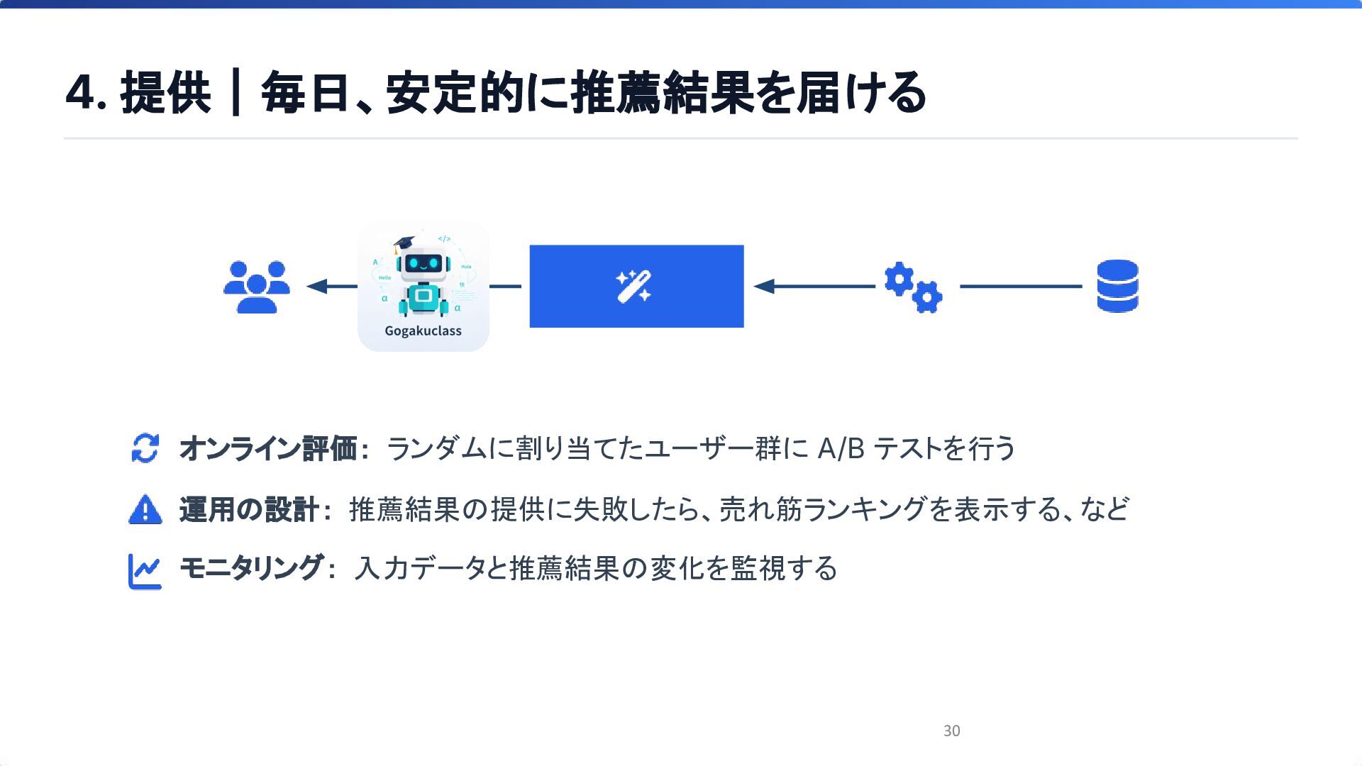 30 4. 提供|毎日、安定的に推薦結果を届ける 運用の設計: 推薦結果の提供に失敗したら、売れ筋ランキングを表示する、など モニタリング: 入力データと推薦結果の変化を監視する オンライン評価: ランダムに割り当てたユーザー群に A/B