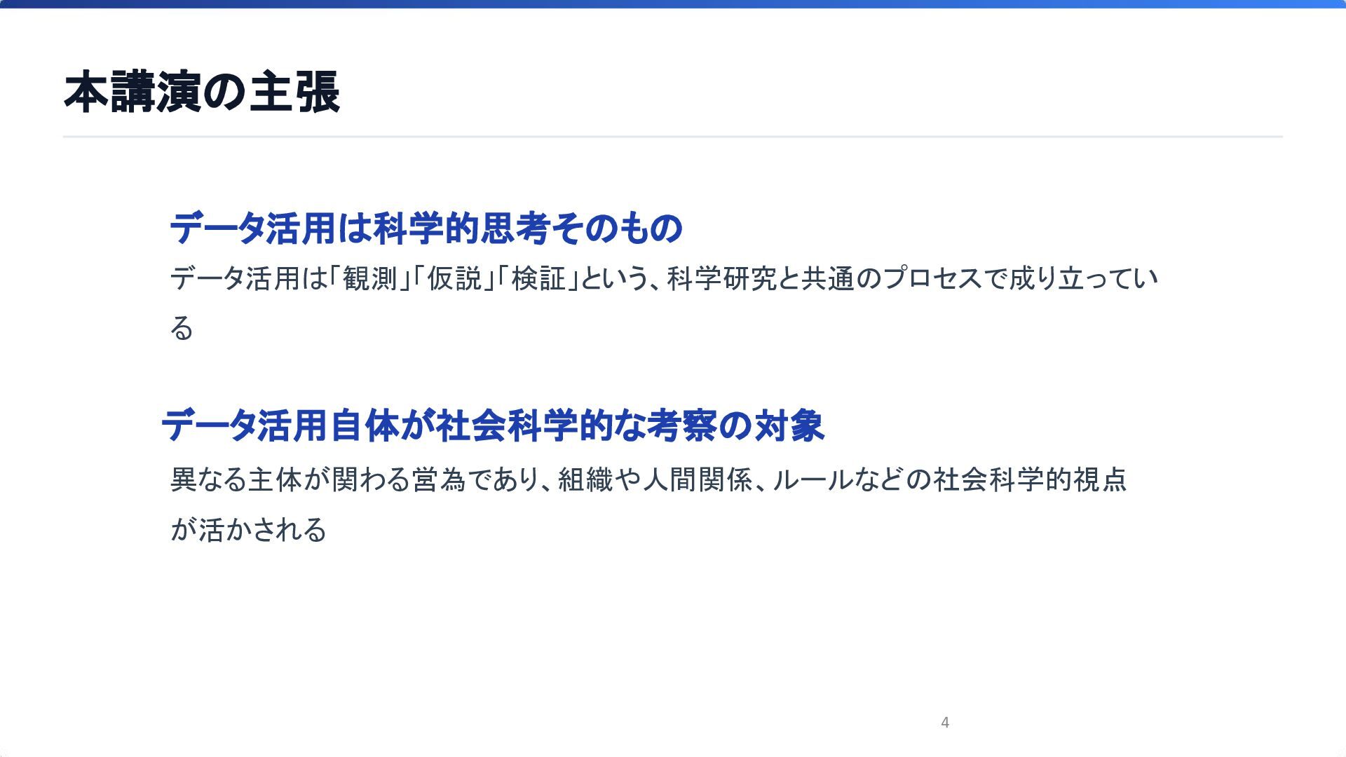 データ活用は科学的思考そのもの データ活用は「観測」「仮説」「検証」という、科学研究と共通のプロセスで成り立ってい る データ活用自体が社会科学的な考察の対象 異なる主体が関わる営為であり、組織や人間関係、ルールなどの社会科学的視点 が活かされる 本講演の主張 4