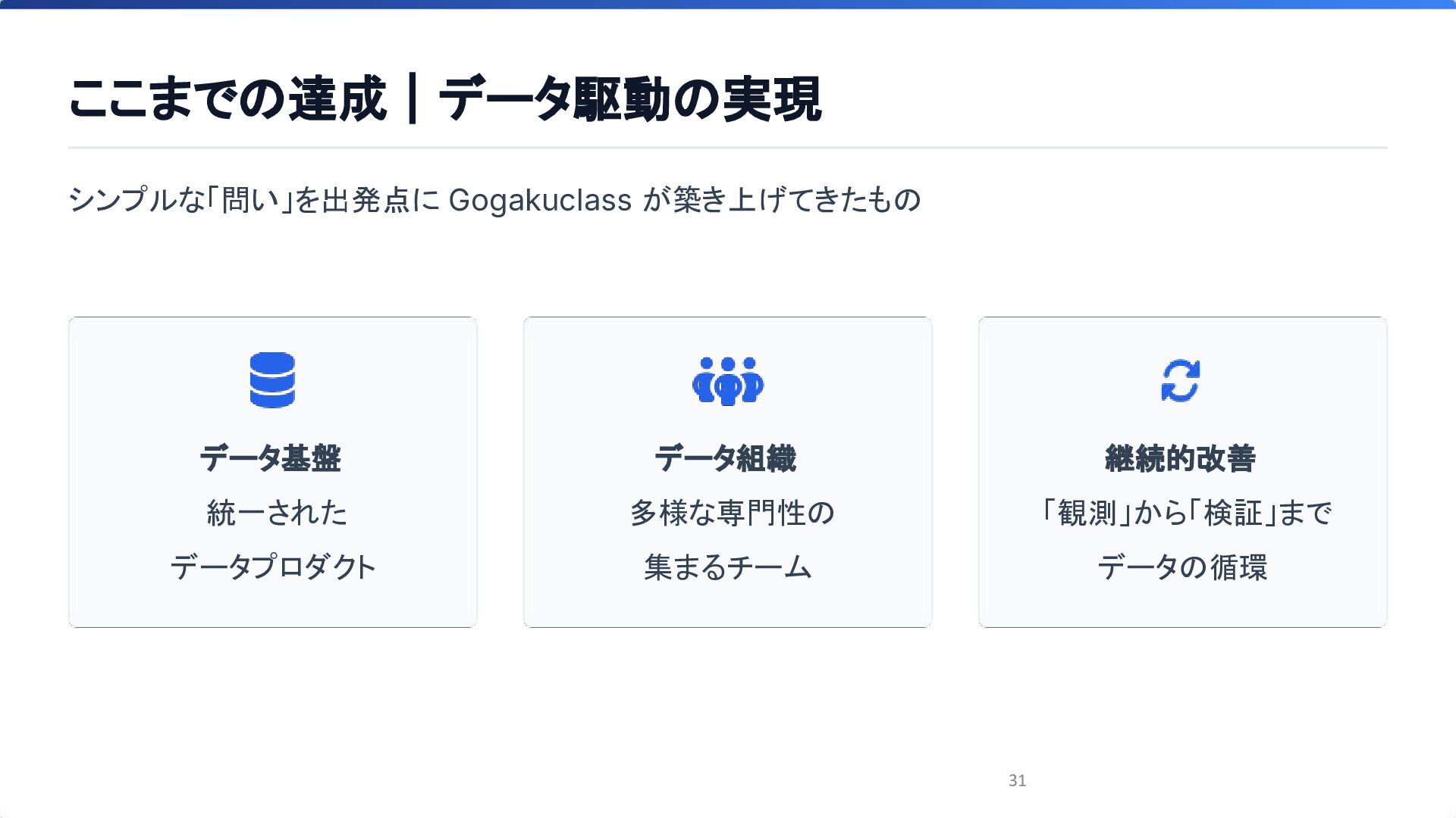 ここまでの達成|データ駆動の実現 31 データ基盤 統一された データプロダクト データ組織 多様な専門性の 集まるチーム 継続的改善 「観測」から「検証」まで