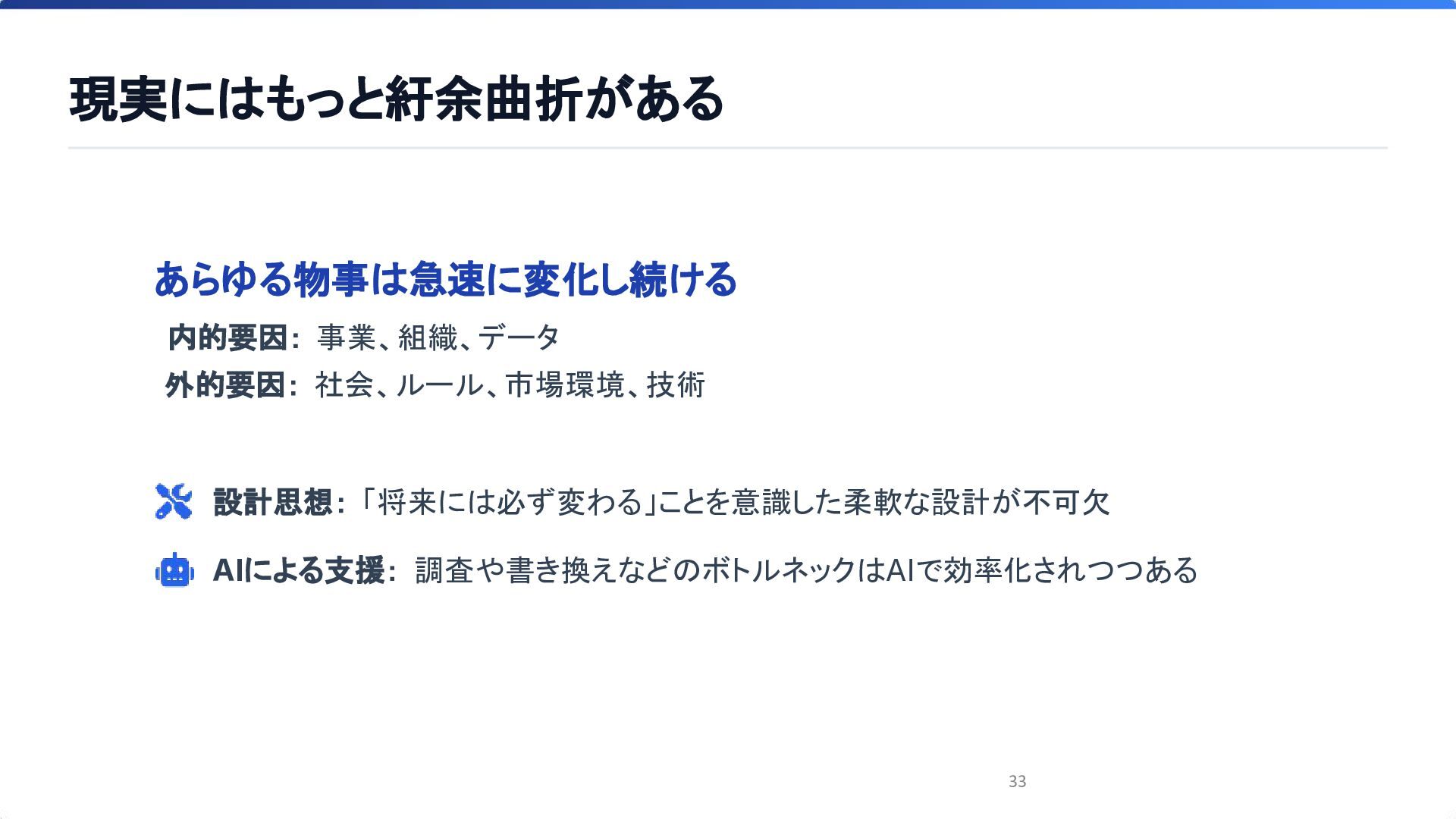 内的要因: 事業、組織、データ 設計思想: 「将来には必ず変わる」ことを意識した柔軟な設計が不可欠 AIによる支援: 調査や書き換えなどのボトルネックはAIで効率化されつつある 現実にはもっと紆余曲折がある 33 あらゆる物事は急速に変化し続ける 外的要因: