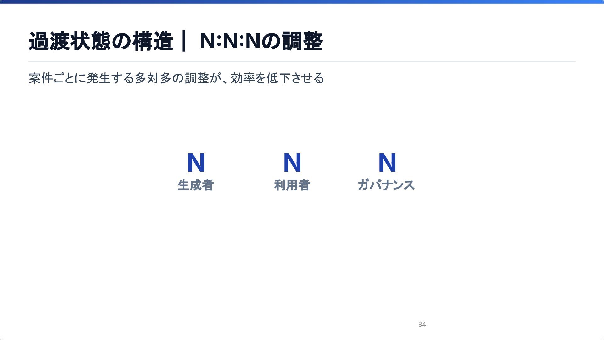 案件ごとに発生する多対多の調整が、効率を低下させる N 生成者 N 利用者 N ガバナンス 過渡状態の構造| NNNの調整 34