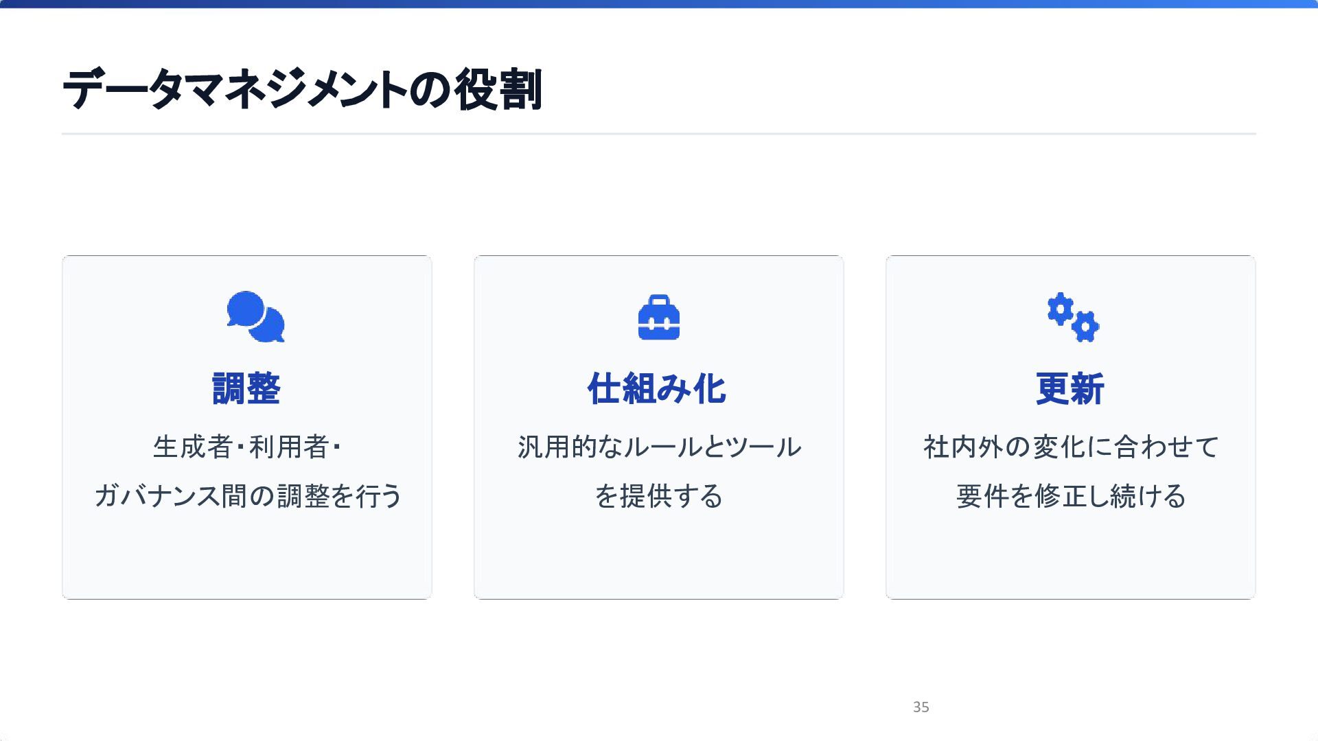 調整 生成者・利用者・ ガバナンス間の調整を行う 仕組み化 汎用的なルールとツール を提供する 更新 社内外の変化に合わせて 要件を修正し続ける データマネジメントの役割