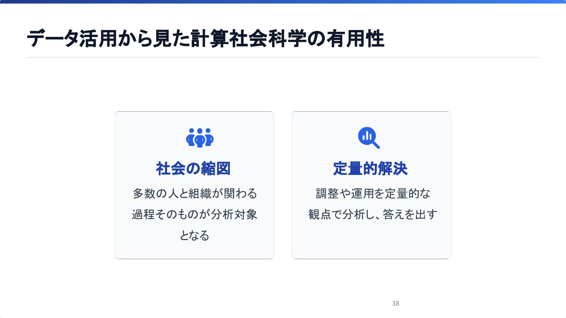 社会の縮図 多数の人と組織が関わる 過程そのものが分析対象 となる 定量的解決 調整や運用を定量的な 観点で分析し、答えを出す データ活用から見た計算社会科学の有用性 38