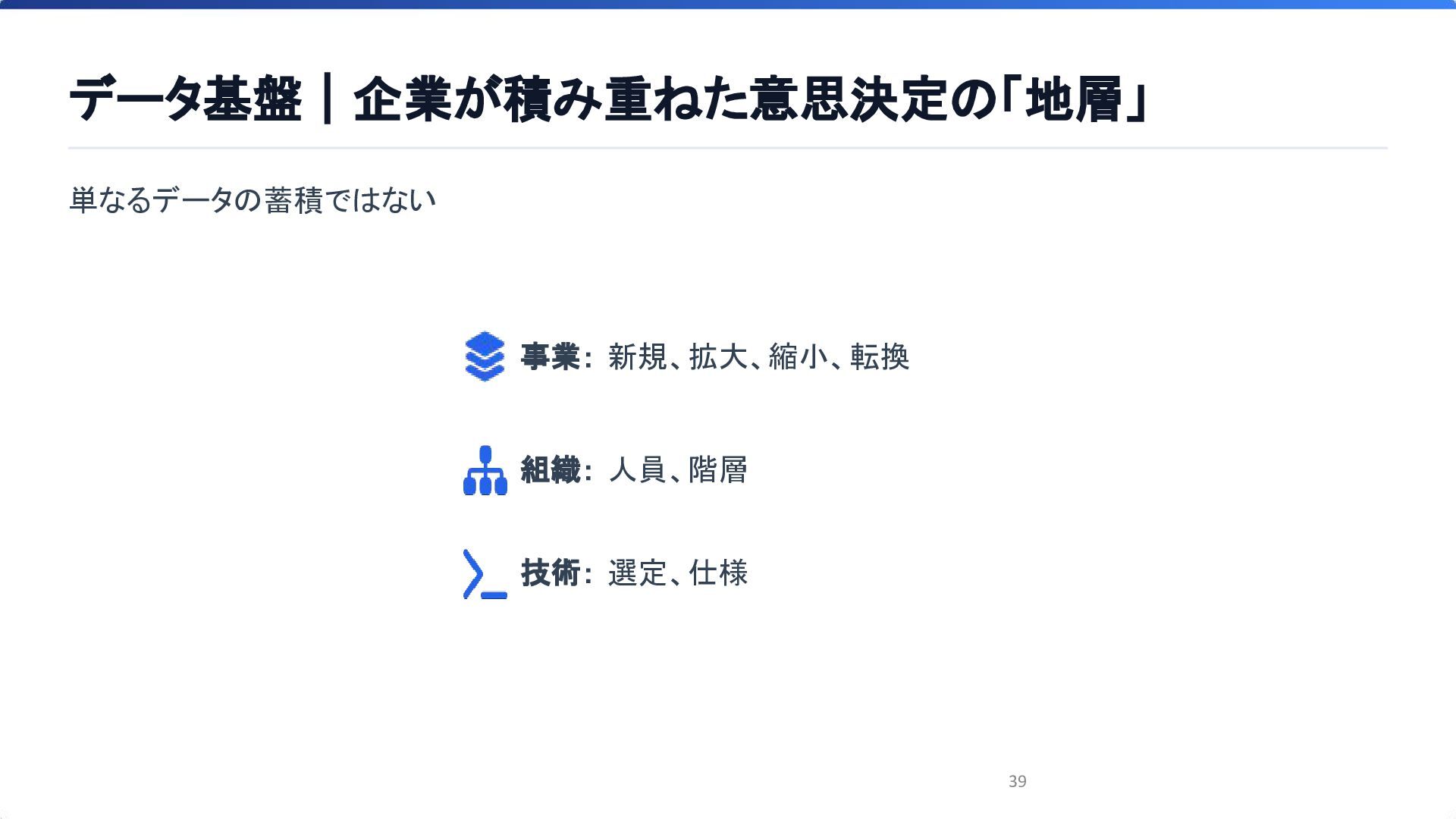 データ基盤|企業が積み重ねた意思決定の「地層」 39 単なるデータの蓄積ではない 事業: 新規、拡大、縮小、転換 組織: 人員、階層 技術: 選定、仕様