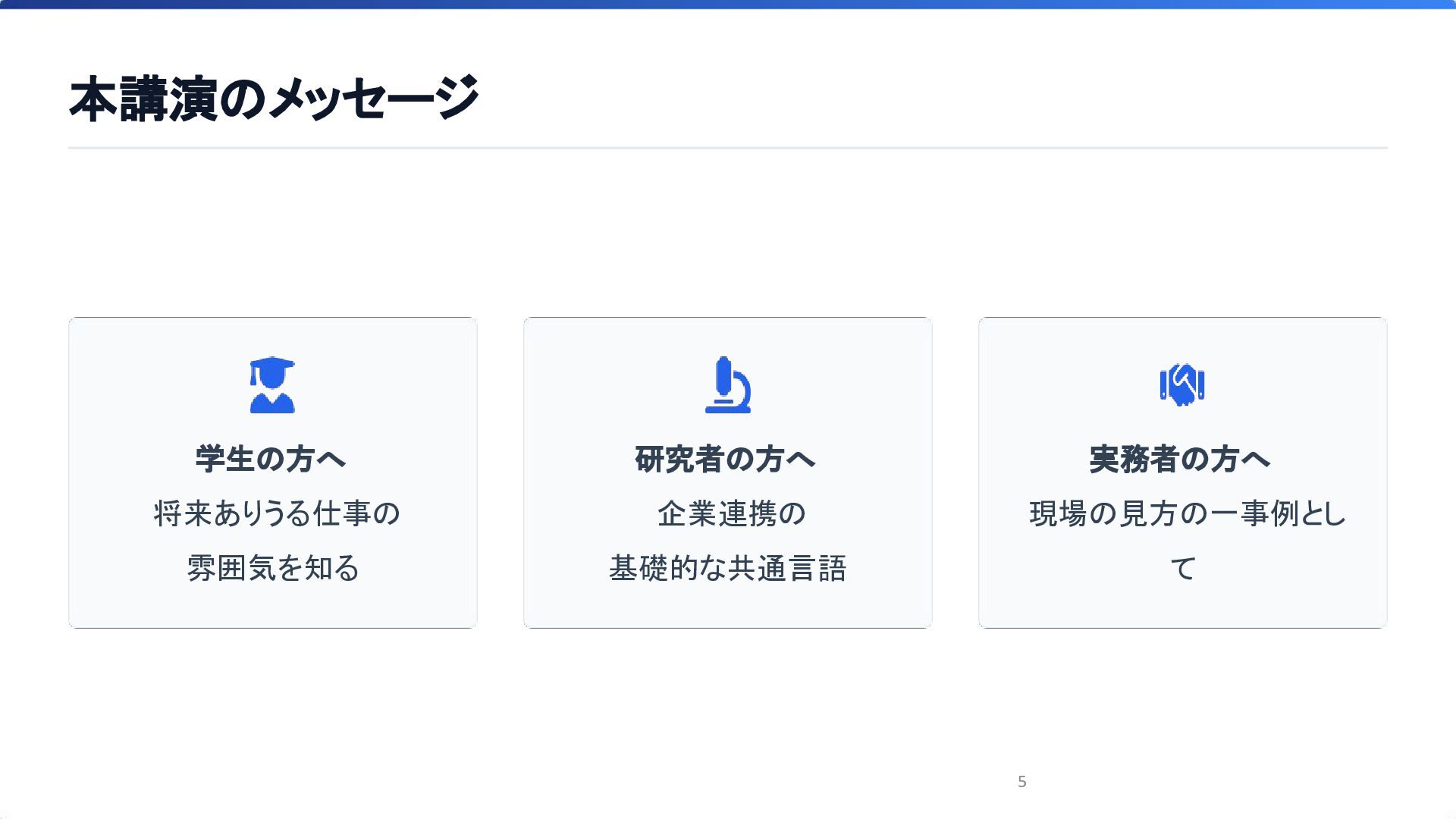 学生の方へ 将来ありうる仕事の 雰囲気を知る 研究者の方へ 企業連携の 基礎的な共通言語 実務者の方へ 現場の見方の一事例とし て 本講演のメッセージ