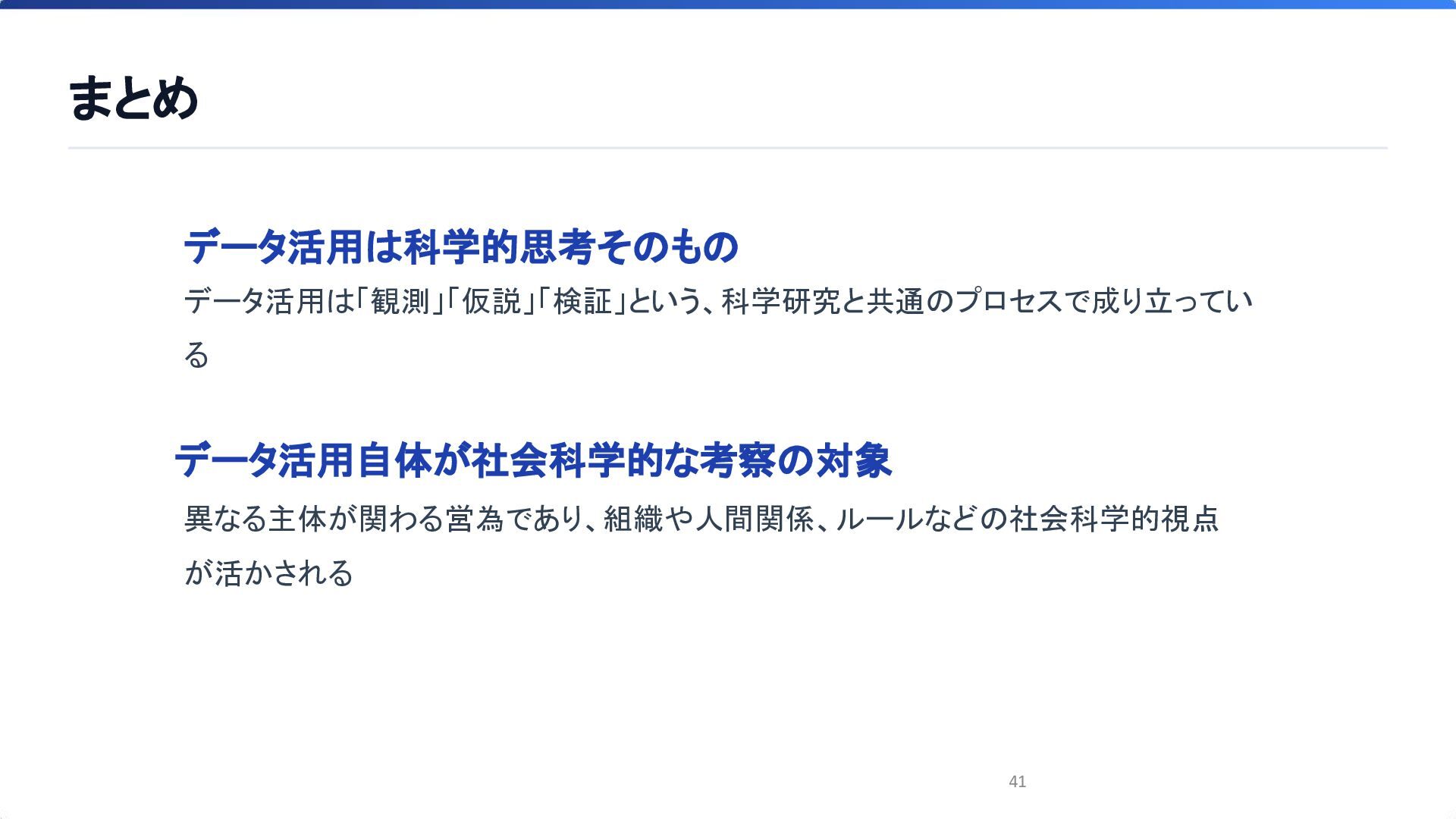 まとめ 41 データ活用は科学的思考そのもの データ活用は「観測」「仮説」「検証」という、科学研究と共通のプロセスで成り立ってい る データ活用自体が社会科学的な考察の対象 異なる主体が関わる営為であり、組織や人間関係、ルールなどの社会科学的視点 が活かされる