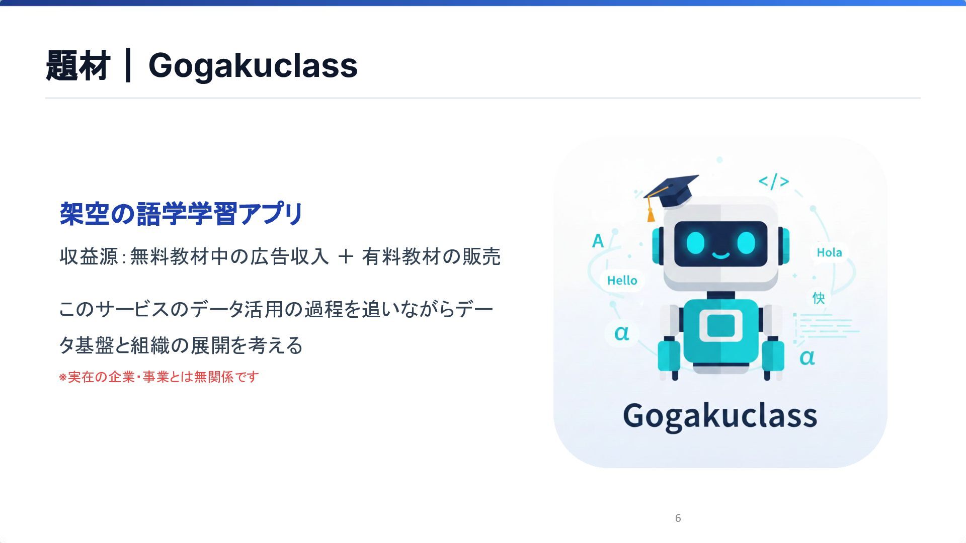 架空の語学学習アプリ 収益源:無料教材中の広告収入 + 有料教材の販売 このサービスのデータ活用の過程を追いながらデー タ基盤と組織の展開を考える ※実在の企業・事業とは無関係です 題材|Gogakuclass 6