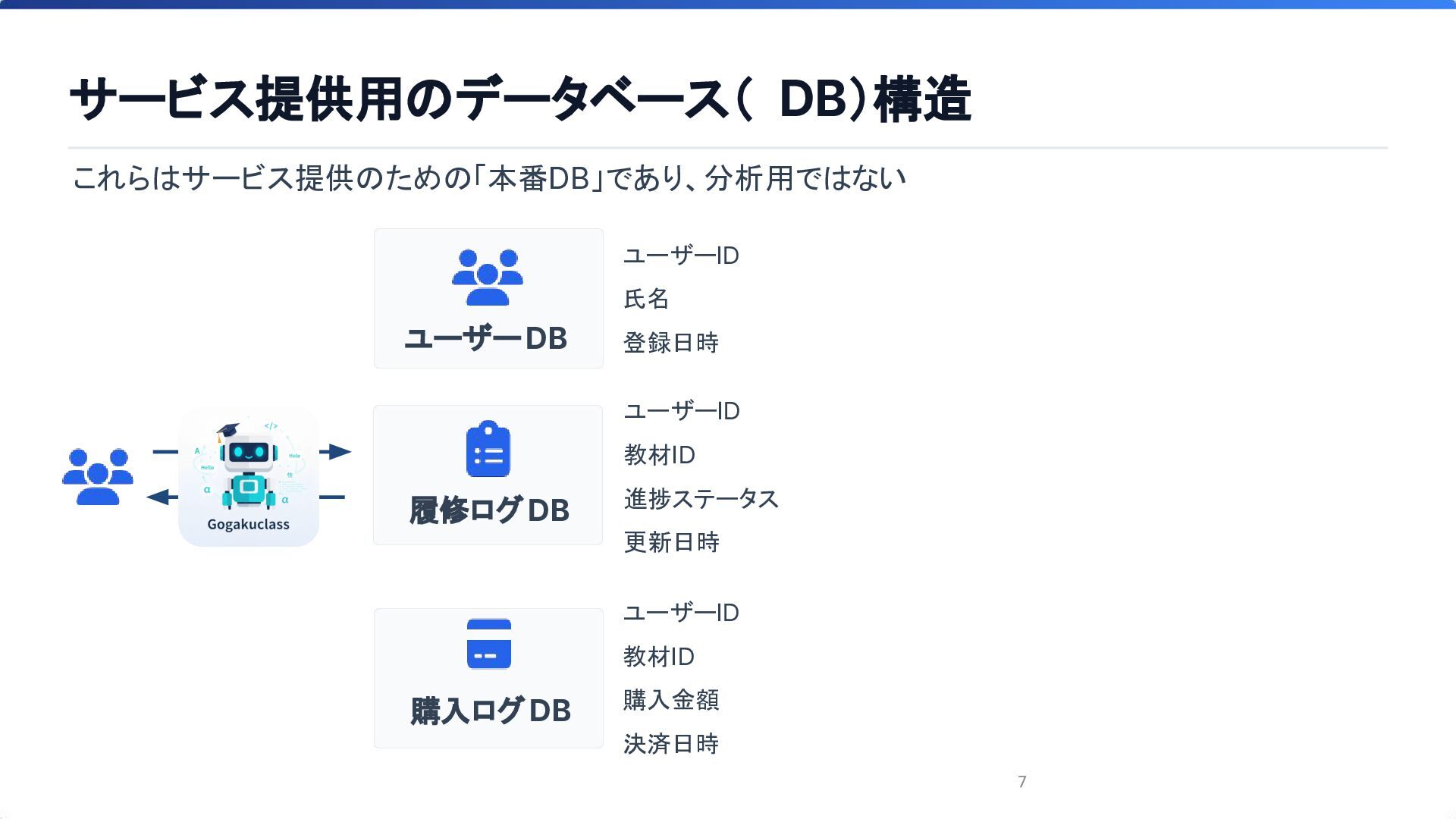 サービス提供用のデータベース( DB)構造 これらはサービス提供のための「本番DB」であり、分析用ではない ユーザーDB ユーザーID 教材ID 進捗ステータス 更新日時 ユーザーID 氏名