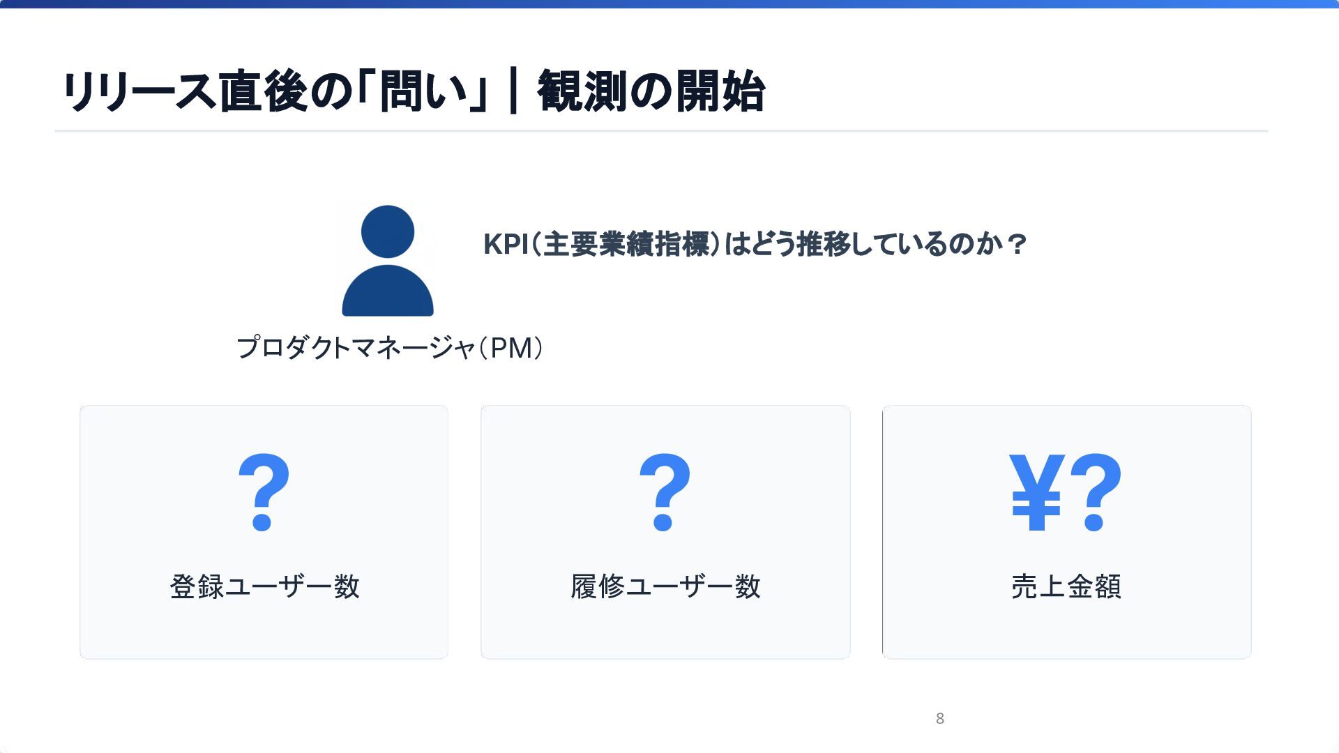 KPI(主要業績指標)はどう推移しているのか? リリース直後の「問い」|観測の開始 8 ? 登録ユーザー数 ? 履修ユーザー数 ¥? 売上金額 プロダクトマネージャ(PM)