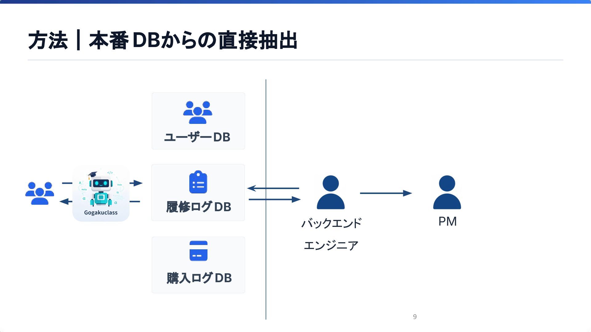 9 方法|本番 DBからの直接抽出 ユーザーDB 履修ログDB 購入ログDB バックエンド エンジニア PM