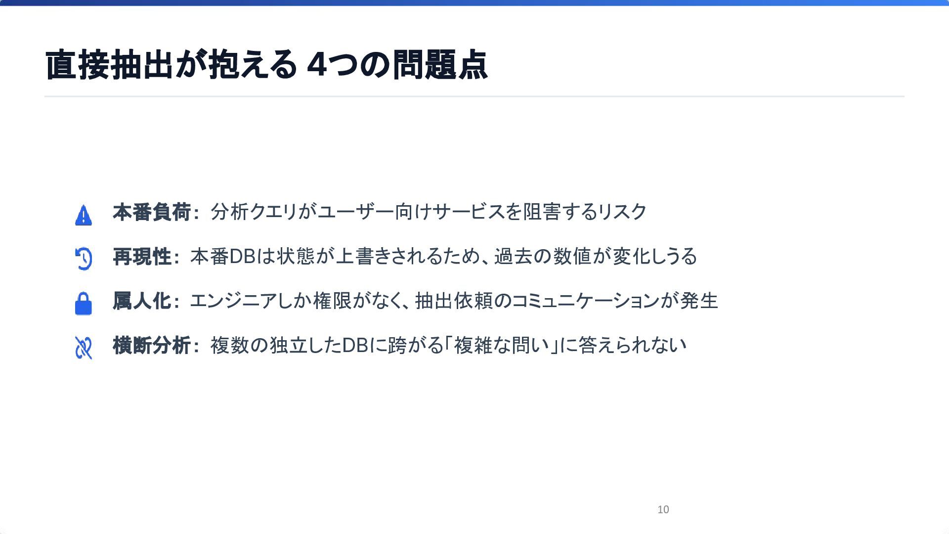 本番負荷: 分析クエリがユーザー向けサービスを阻害するリスク 再現性: 本番DBは状態が上書きされるため、過去の数値が変化しうる 属人化: エンジニアしか権限がなく、抽出依頼のコミュニケーションが発生 横断分析: 複数の独立したDBに跨がる「複雑な問い」に答えられない 直接抽出が抱える 4つの問題点