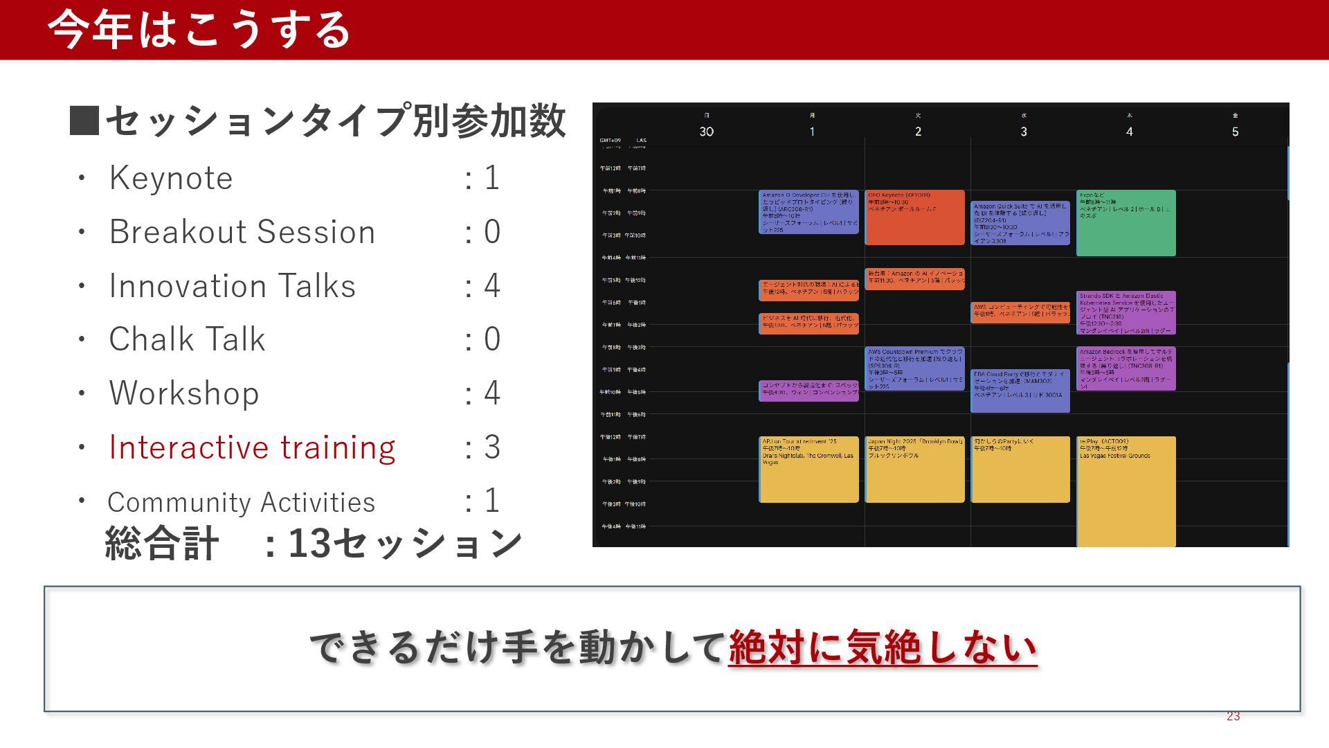 : 0 ・ Innovation Talks : 4 ・ Chalk Talk : 0 ・ Workshop : 4 ・ Interactive training : 3 ・ Community Activities : 1 総合計 : 13セッション できるだけ手を動かして絶対に気絶しない