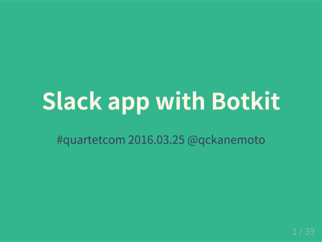 t = r e q u i r e ( ' b o t k i t ' ) ; v a r c o n t r o l l e r = B o t k i t . s l a c k b o t ( { d e b u g : f a l s e , j s o n _ f i l e _ s t o r e : ' . / s i m p l e _ s t o r a g e / ' } ) ; c o n t r o l l e r . s e t u p W e b s e r v e r ( p r o c e s s . e n v . P O R T , f u n c t i o n ( e r r , w e b s e r v e r ) { c o n t r o l l e r . c r e a t e W e b h o o k E n d p o i n t s ( w e b s e r v e r ) ; } ) ; c o n t r o l l e r . o n ( ' s l a s h _ c o m m a n d ' , f u n c t i o n ( b o t , m e s s a g e ) { i f ( m e s s a g e . c o m m a n d = = ' / h e l l o ' ) { b o t . r e p l y P u b l i c ( m e s s a g e , ' H e l l o y o u r s e l f . ' ) ; } } ) ; 19 / 39