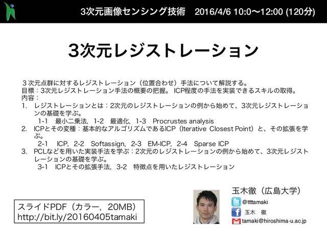 ۚ୩ ݈Ұ, 3࣍ݩ૬ࣅมͷ࠷దԽܭࢉɿ Ψεɾχϡʔτϯ๏vs.ΨεɾϔϧϚʔτ๏, 2011- CG145CVIM179-12, 2011.11. • ݪ༟وɼ৽࠺߂ਸɼۚ୩݈Ұɼ ෆۉҰͳޡࠩΛۭͭؒ σʔλ͔Βͷ3࣍ݩ૬ࣅมͷ࠷దܭࢉ, 2010-CVIM-176-15, 2011.3 • L. Dryden, K. V. Mardia, Statistical shape analysis, Wiley, 1998. • Berthold K. P. Horn. Closed-form solution of absolute orientation using unit quaternions. Journal of the Optical Society of America, Vol. 4, pp. 629–642, 1987. • Shinji Umeyama. Least-squares estimation of transformation parameters between two point patterns. IEEE Trans. on Pattern Analysis and Machine Intelligence, Vol. 13, No. 4, pp. 376–380, 1991. Toru Tamaki, Shunsuke Tanigawa, Yuji Ueno, Bisser Raytchev, Kazufumi Kaneda: "Scale matching of 3D point clouds by finding keyscales with spin images,” ICPR2010. Baowei Lin, Toru Tamaki, Fangda Zhao, Bisser Raytchev, Kazufumi Kaneda, Koji Ichii, "Scale alignment of 3D point clouds with different scales," Machine Vision and Applications, November 2014, Volume 25, Issue 8, pp 1989-2002 (2014 11). DOI: 10.1007/s00138-014-0633-2 n Keyscale n ̏࣍ݩ܈ͷେ͖͞ಛྔΛද͢εέʔϧΛ ݟ͚ͭͯͦΖ͑Δʢkeypointͷεέʔϧ൛ʣ ߶ମมͷ߹ ૬ࣅมͷ߹ &JHFOVNFZBNB pcl::registration::Transformation EstimationSVDScale