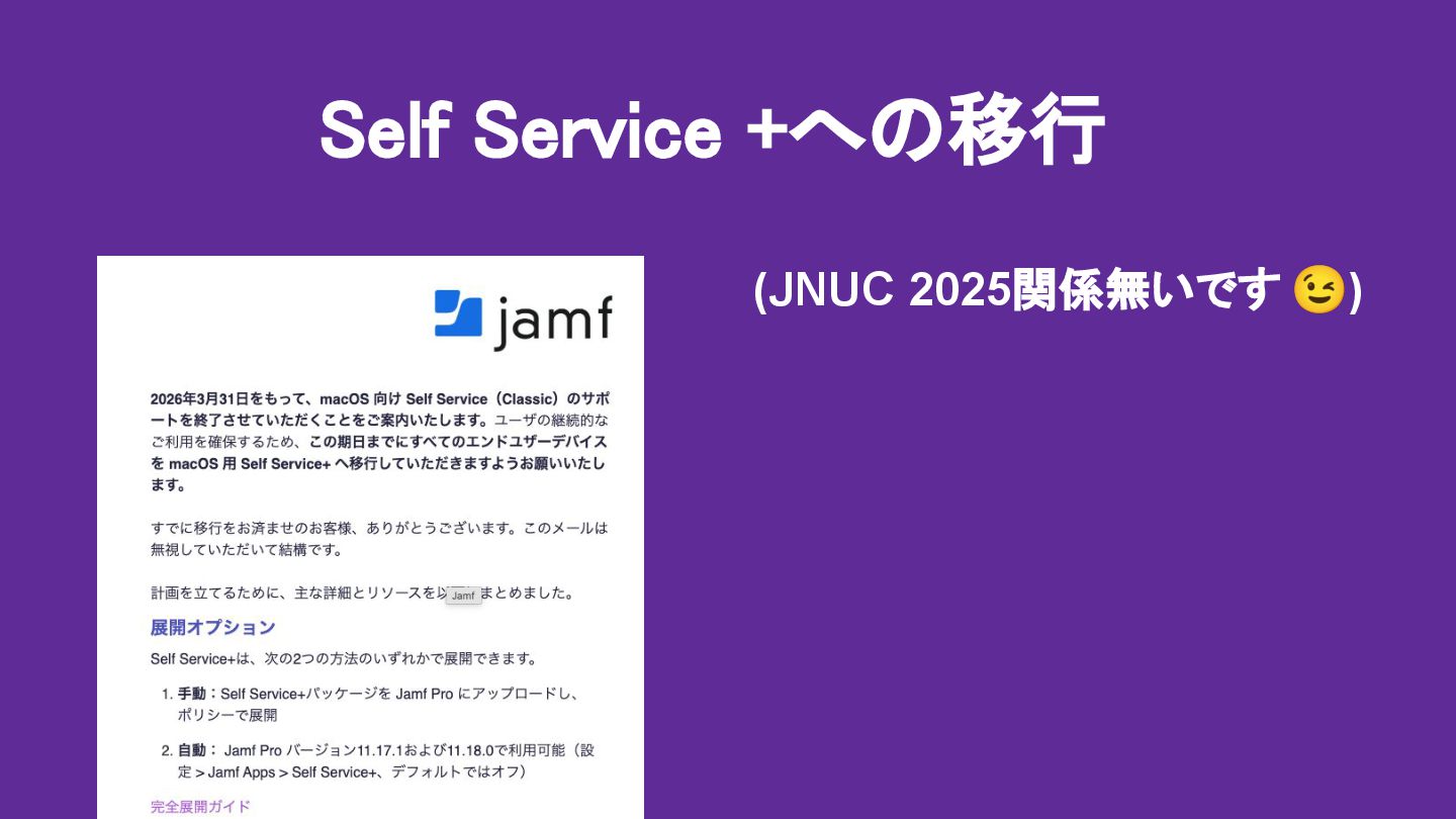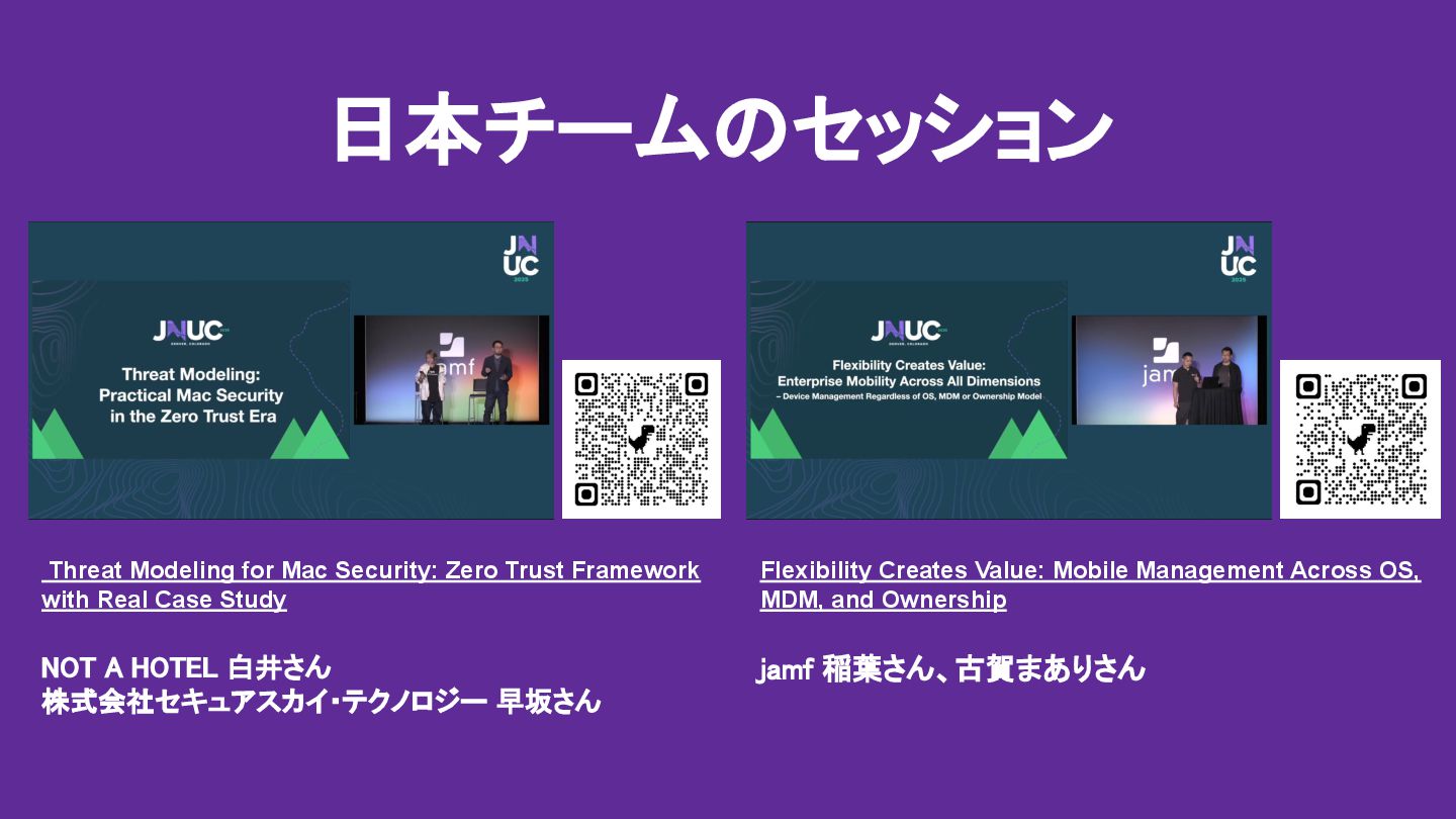 Framework with Real Case Study 白井さん 株式会社セキュアスカイ・テクノロジー 早坂さん Flexibility Creates Value: Mobile Management Across OS, MDM, and Ownership jamf 稲葉さん、古賀まありさん