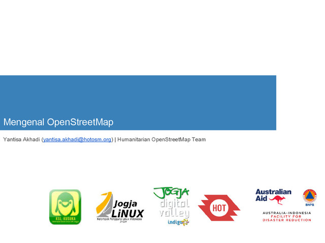 of the whole world http://wiki.openstreetmap.org/wiki/About Dibawah lisensiOpen Data Commons Open Database License (ODbL) : ◦ Bebas berbagi: menyalin, mendistribusikan dan menggunakan database ◦ Bebas mencipta: menghasilkan produk dari database ◦ Bebas mengadaptasi: memodifikasi, mengubah bentuk dan membangun dari database Selama ◦ Mencantumkan sumber, memiliki lisensi yg sama dan tetap terbuka