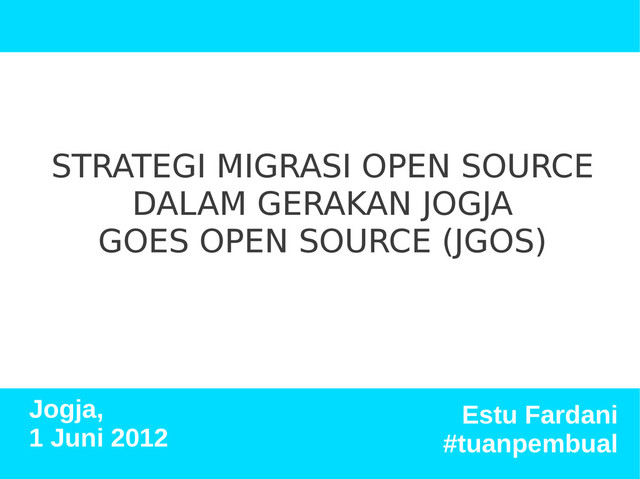 pola migrasi. • Membuktikan bahwa migarsi open source bukan merupakan proses yang sulit bagi instansi pemerintah. • Mendukung gerakan Indonesia Goes Open Source (IGOS). • Membantu penghematan APBD dalam bidang pengadaan perangkat lunak. • Membantu mengurangi pembajakan perangkat lunak.