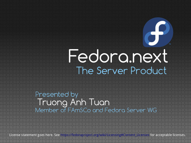 FAmSCo and Fedora Server WG License statement goes here. See https://fedoraproject.org/wiki/Licensing#Content_Licenses for acceptable licenses. Fedora.next