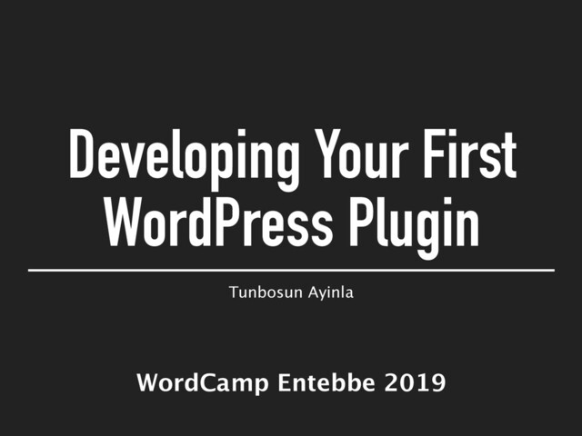 is always recommended to create a directory to hold your plugin file ‣ Always prefix your function names ‣ Sanitize all input data ‣ Enable debug mode when developing a plugin define( 'WP_DEBUG', true ); IMPORTANT NOTES