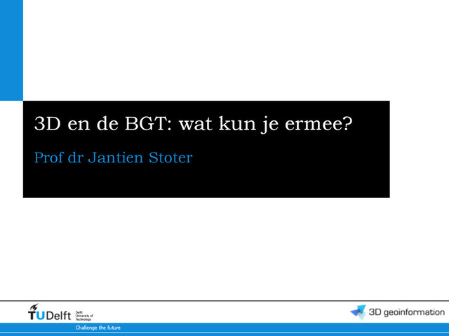 3D • Breder dan “steden” • Geometrie en thematiek • OGC standard sinds 2008 • http://www.opengeospatial.org/standards/citygml CityGML 3D intro 3D BGT 3D BAG 3D TOP10NL Manifest Building Module CityFurniture Module Relief Module Transportation Module Vegetation Module WaterBody Module Tunnel Module Bridge Module
