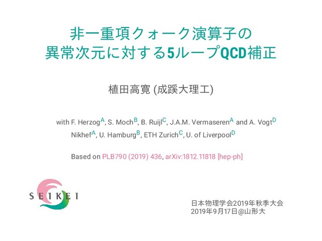 scalar Feynman積分を解析的に行うF プログラム https://github.com/benruijl/forcer Ruijl, TU, Vermaseren ’ Applications include: • -loop QCD propagators and vertices Ruijl, TU, Vermaseren, Vogt ’ • -loop QCD splitting functions Davies, Vogt, Ruijl, TU, Vermaseren ’ 6; Moch, Ruijl, TU, Vermaseren, Vogt ’ , ’ 8 F + IRR: • -loop QCD β function Herzog, Ruijl, TU, Vermaseren, Vogt ’ ; Chetyrkin, Falcioni, Herzog, Vermaseren ’ • -loop Higgs decay to gluons Herzog, Ruijl, TU, Vermaseren, Vogt ’ • - and -loop anomalous dimensions of Weinberg operator de Vries, Falcioni, Herzog, Ruijl ’ /