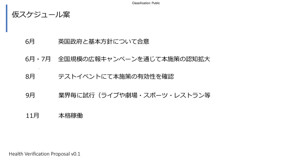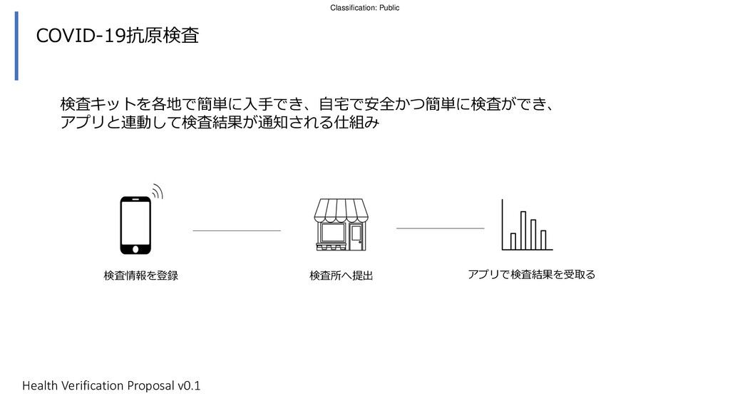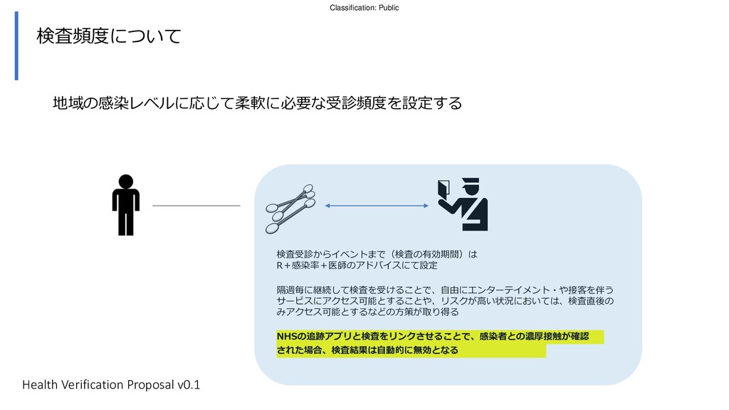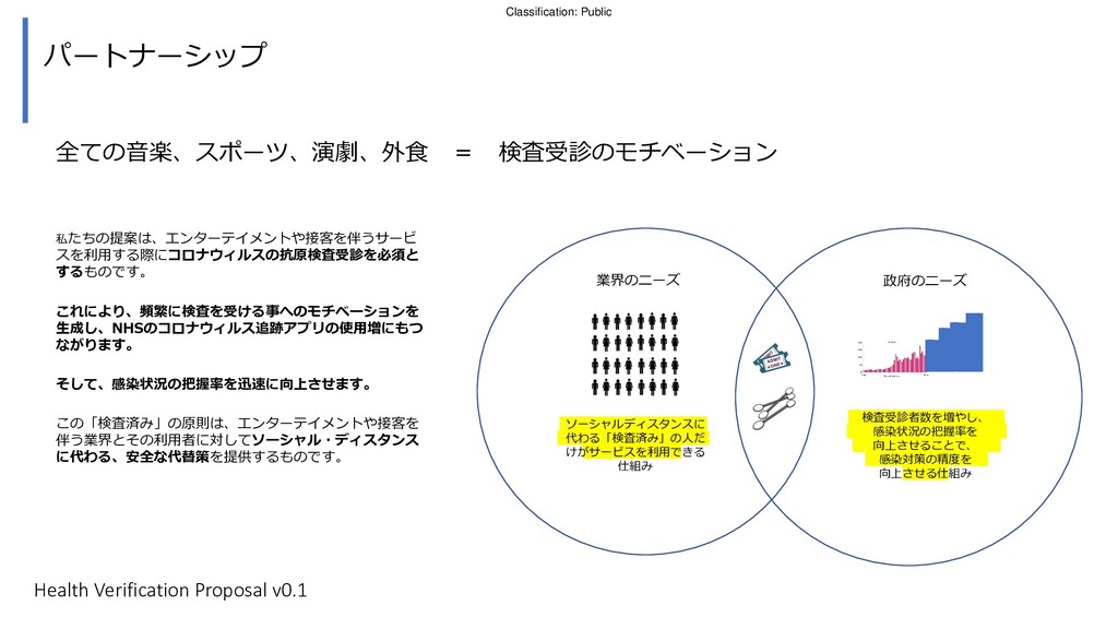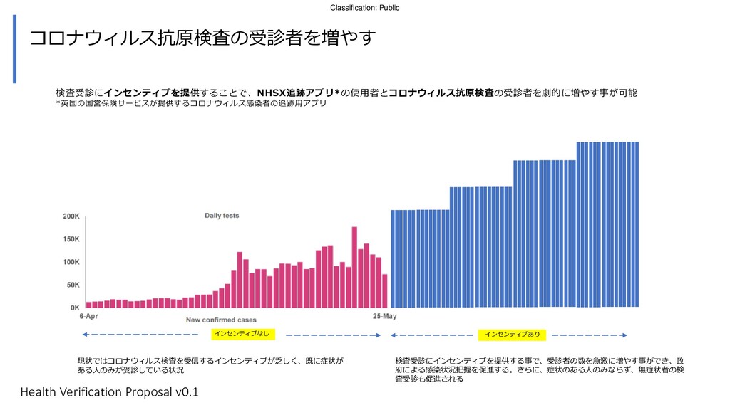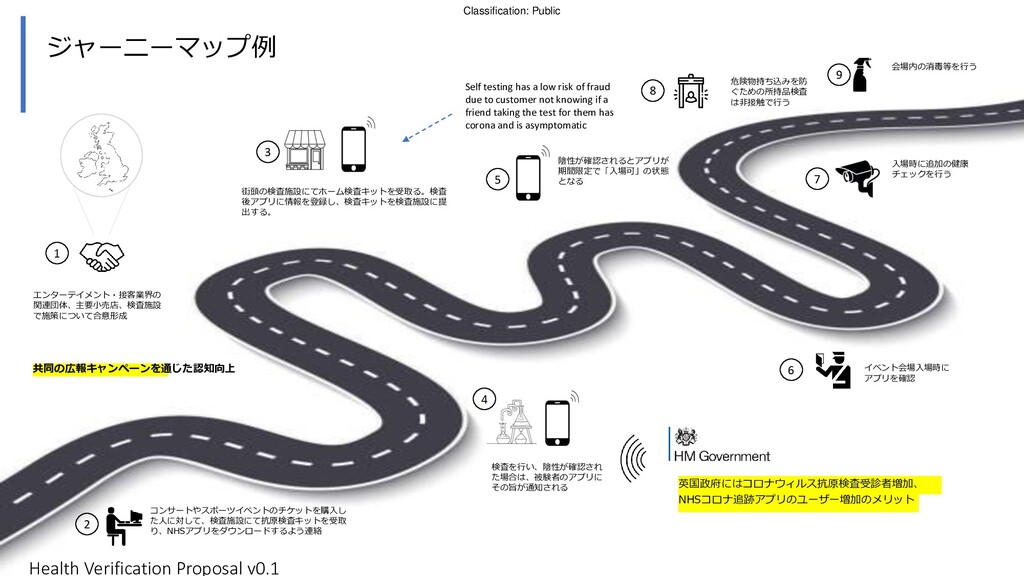 コンサートやスポーツイベントのチケットを購入し た人に対して、検査施設にて抗原検査キットを受取 り、NHSアプリをダウンロードするよう連絡 街頭の検査施設にてホーム検査キットを受取る。検査 後アプリに情報を登録し、検査キットを検査施設に提 出する。 ジャーニーマップ例 イベント会場入場時に アプリを確認 入場時に追加の健康 チェックを行う 危険物持ち込みを防 ぐための所持品検査 は非接触で行う 会場内の消毒等を行う 2 6 7 8 1 3 9 検査を行い、陰性が確認され た場合は、被験者のアプリに その旨が通知される 英国政府にはコロナウィルス抗原検査受診者増加、 NHSコロナ追跡アプリのユーザー増加のメリット 4 5 陰性が確認されるとアプリが 期間限定で「入場可」の状態 となる Self testing has a low risk of fraud due to customer not knowing if a friend taking the test for them has corona and is asymptomatic Health Verification Proposal v0.1
