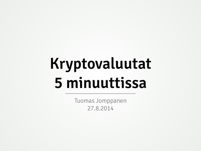 dollaria •Bitcoineja 13.2 miljoonaa •74000 tapahtumaa päivässä (27.8.2014) •21 miljoonaa bitcoinia on maksimimäärä •Liikkeellelasku •Uusia bitcoineja luodaan louhimalla •Liikkeellelasku sisäänrakennettu algoritmiin •Ennalta ennustettavissa ja kaikkien tiedossa •Vuonna 2040 99.9% kaikista bitcoineista on laskettu liikkeelle •Millään taholla ei ole mahdollisuutta painaa uutta rahaa