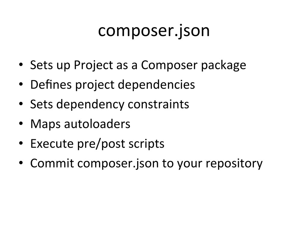 • Defines project dependencies • Sets dependency constraints • Maps autoloaders • Execute pre/post scripts • Commit composer.json to your repository