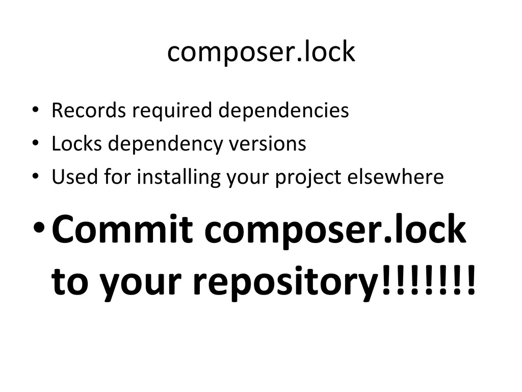 versions • Used for installing your project elsewhere • Commit composer.lock to your repository!!!!!!!