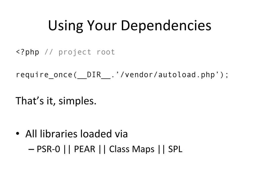 it, simples. • All libraries loaded via – PSR-‐0 || PEAR || Class Maps || SPL