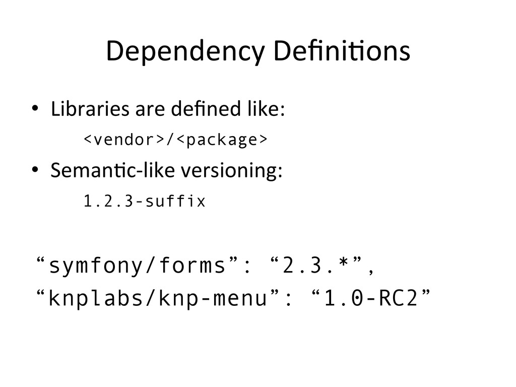 • SemanAc-‐like versioning: 1.2.3-suffix “symfony/forms”: “2.3.*”, “knplabs/knp-menu”: “1.0-RC2”