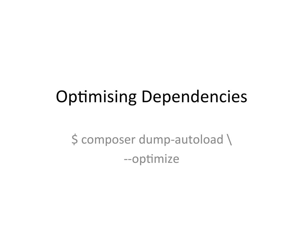 OpAmising Dependencies $ composer dump-‐autoload \ -‐-‐opAmize