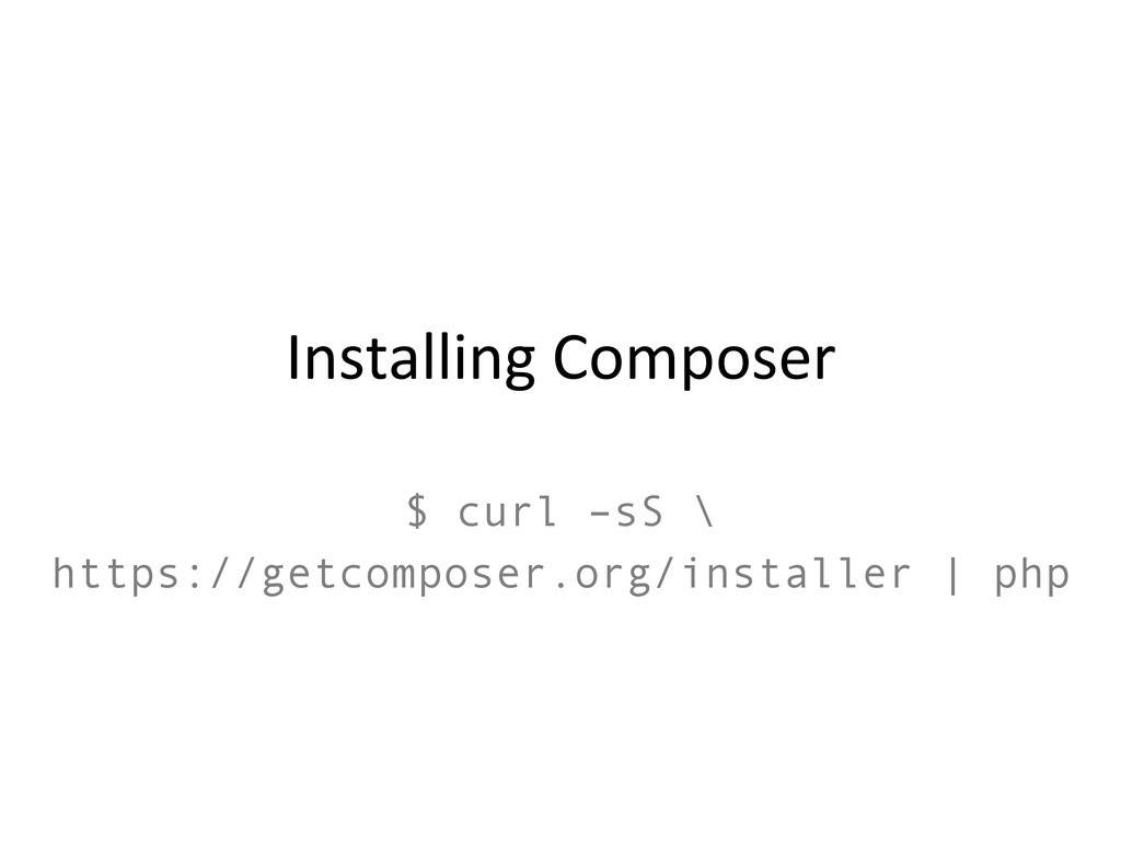 Installing Composer $ curl –sS \ https://getcomposer.org/installer | php